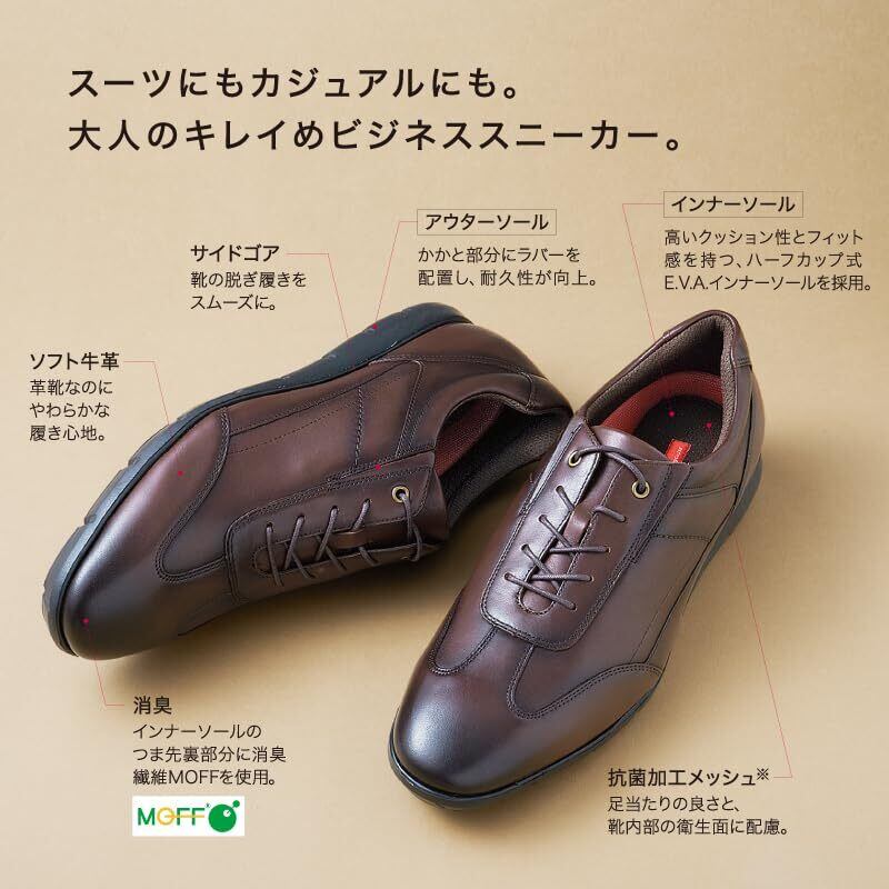 人気のtexcy luxe『軽量ビジネススニーカー』 艶やかな本革を使用し、柔らかく履きやすい。耐久性向上のため踵部にラバーを採用。履き口には足あたりのよいナイロンパットを搭載。立体成型のカップインソール採用、つま先部には消臭繊維【MOFF】を使用しているので気になる臭いをシャットアウトしてくれます。アウターソールには屈曲溝を多く配置し曲がりやすく設計。スムーズな歩行をサポートします。お手頃価格で機能満載のビジネススニーカーです!