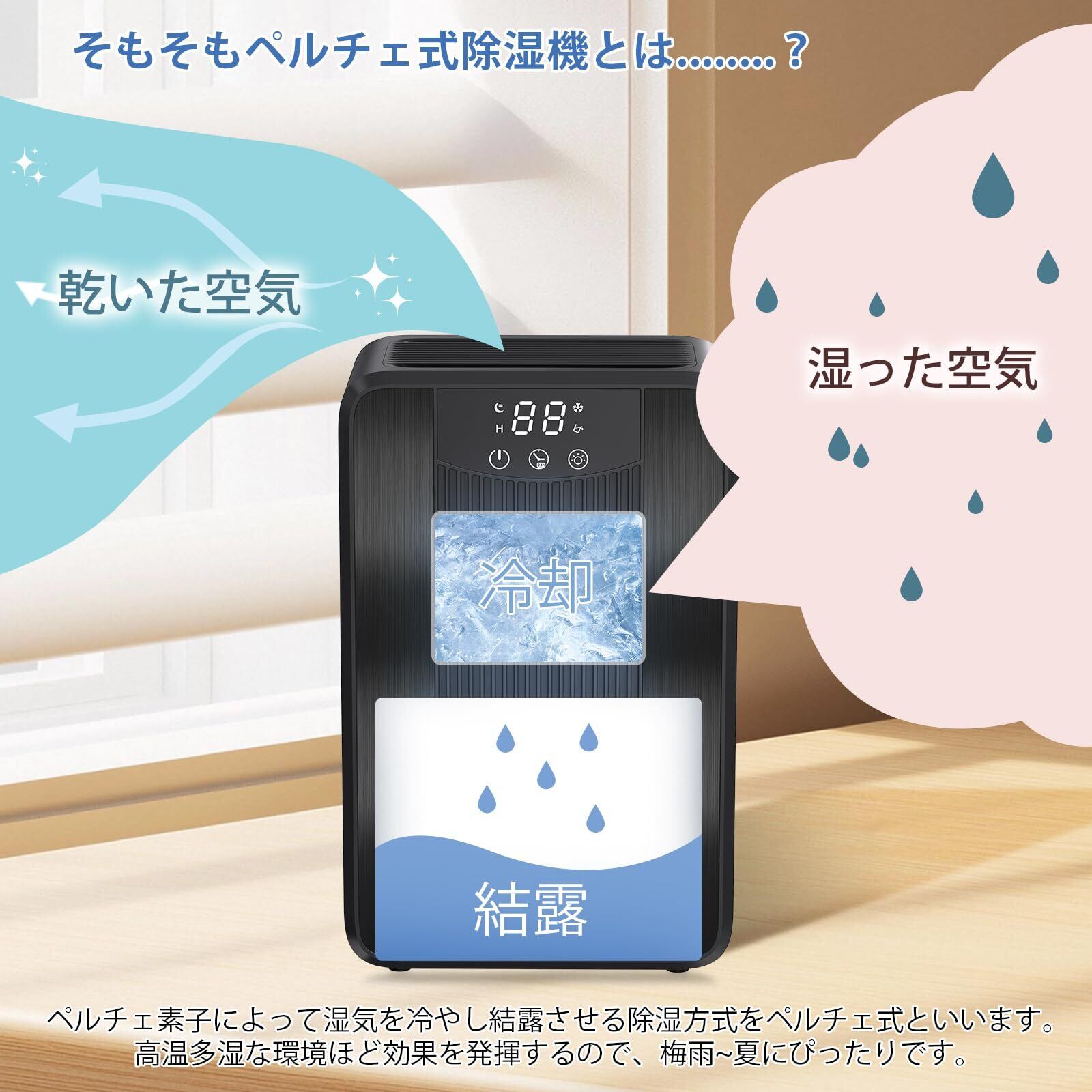 【ペルチェ除湿機、高効率除湿可能】ペルチェ素子によって湿気を冷やし結露させる除湿方式をペルチェ式除湿機です。1000ML大容量排水タンクが搭載され、一日あたりの除湿量はなんと500mlです(室温30℃、湿度RH80%の場合)、長時間連続使用可能。梅雨や夏場の高温多湿の時期に、冬の結露時などに活躍し、カビや湿気、結露の問題を一挙に解決します。