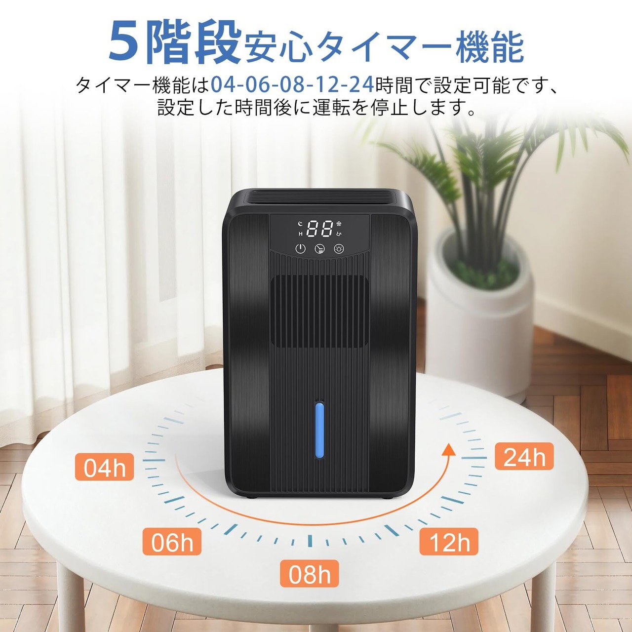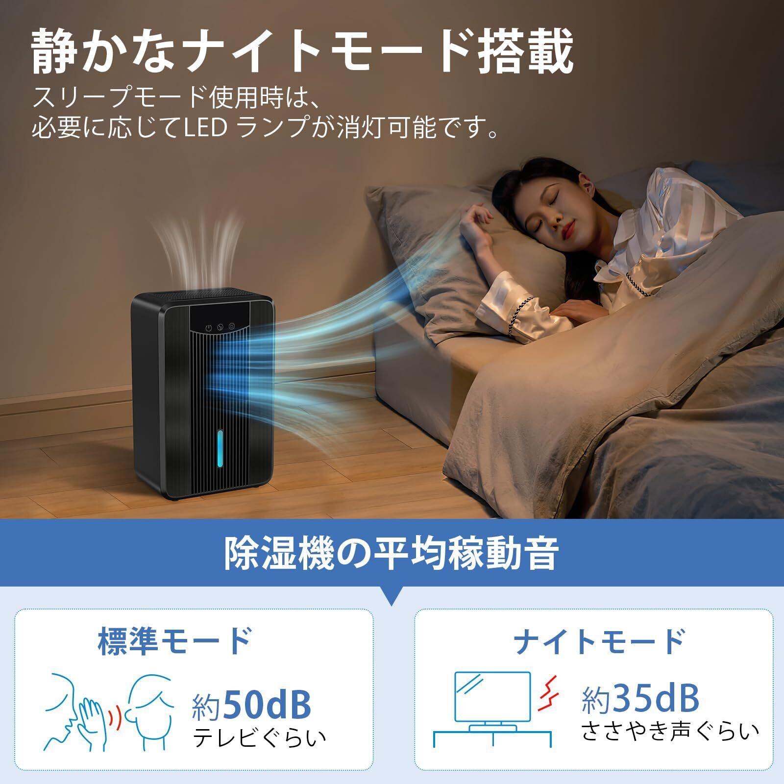 【5階段安心タイマーを付き】タイマーは4・6・8・12・24時間に設定することができます、設定した時間後に運転を停止します、就寝や外出の際にも重宝に使用可能です、無駄な電気代の心配がない。ナイトモードで、除湿機の操作音はわずか40dB、寝室や子供部屋に置いてもほとんど気にすることもなく快適に眠ることができます。デジタル画面が消灯し、就寝時の気になる光を軽減、風量の弱設定を自動で行います。