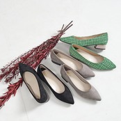 ヒールのカラーを、ブラックはグレー、グレーはネイビー、グリーンはベージュと、全て異なる配色にすることでさりげない遊び心をオン