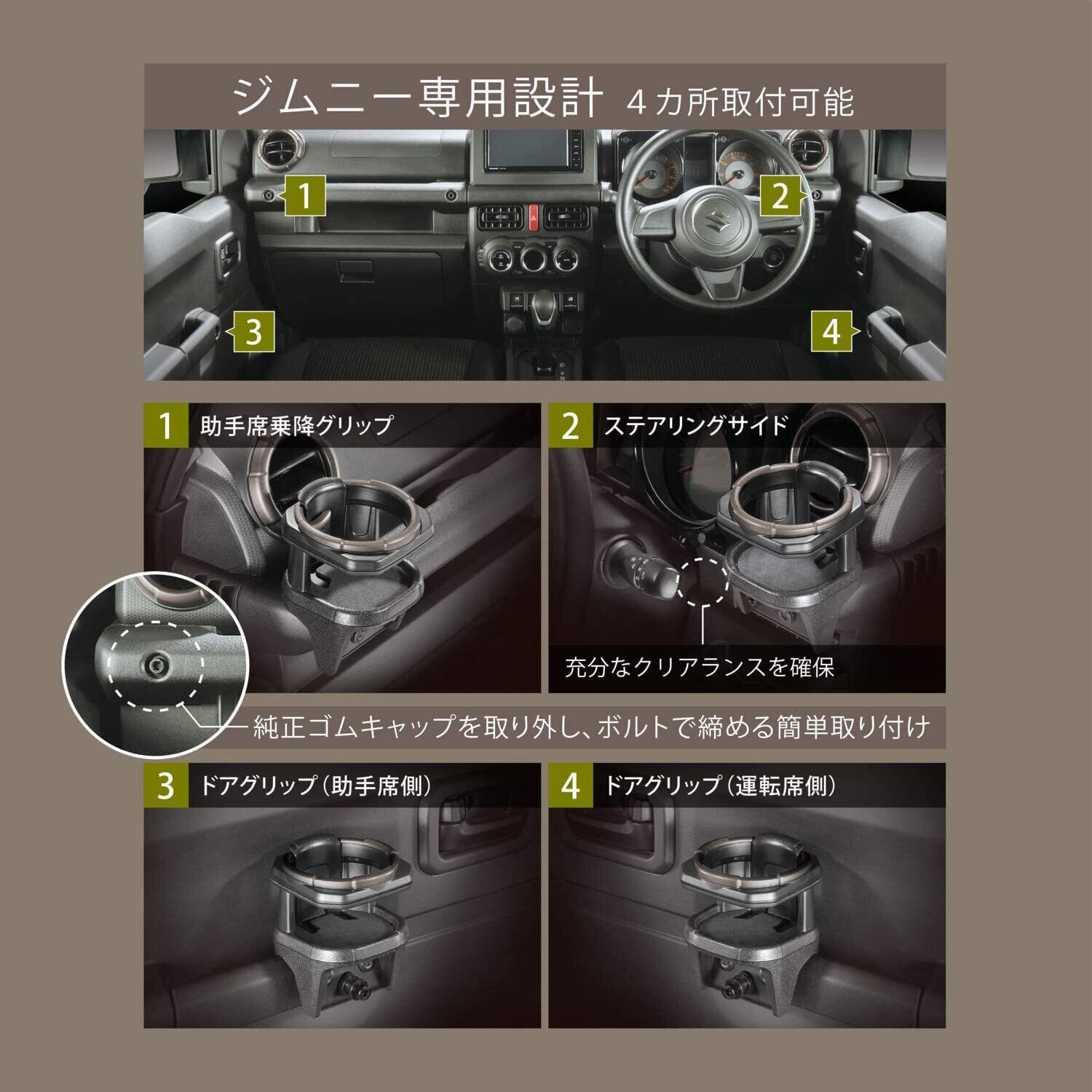 本製品はジムニー(JB64)、ジムニーシエラ(JB74)ジムニーノマド(JC74)専用のドリンクホルダーです。ステアリングサイド、助手席乗降グリップのエアコン側、運転席側・助手席側のドアグリップの4カ所に取り付けることができます。ダミーボルトを外し、車両に付いているナットにボルトで取り付けるため、しっかりと取り付けることができます。