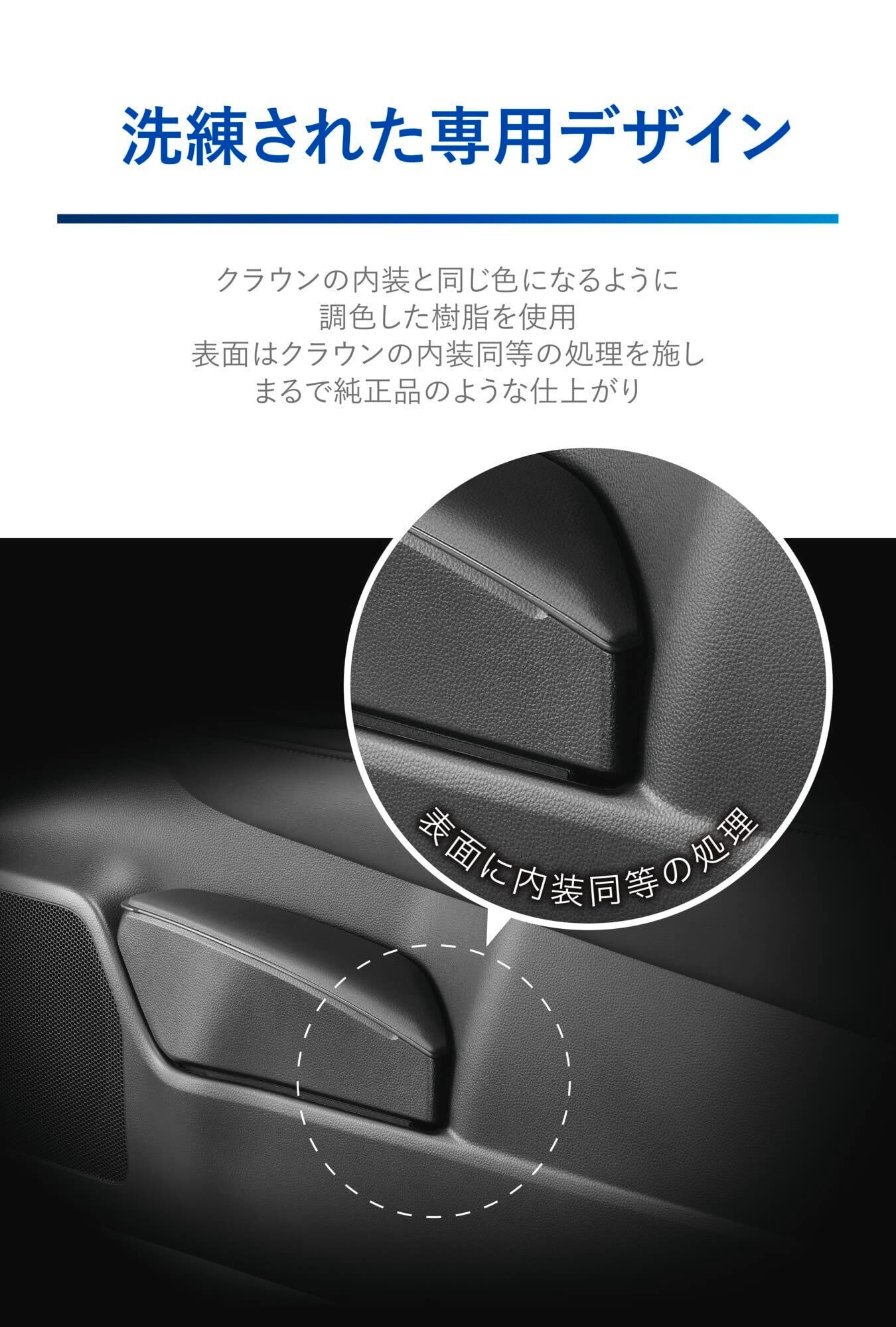 【まるで純正品 かのような洗練された専用デザイン】 クラウン専用デザインなので、クラウンの内装色と同じ色になるように調色した樹脂を使用しています。ボディはクラウンの内装の質感に合わせた革シボのデザインを施すことで、車両との一体感を向上させました。