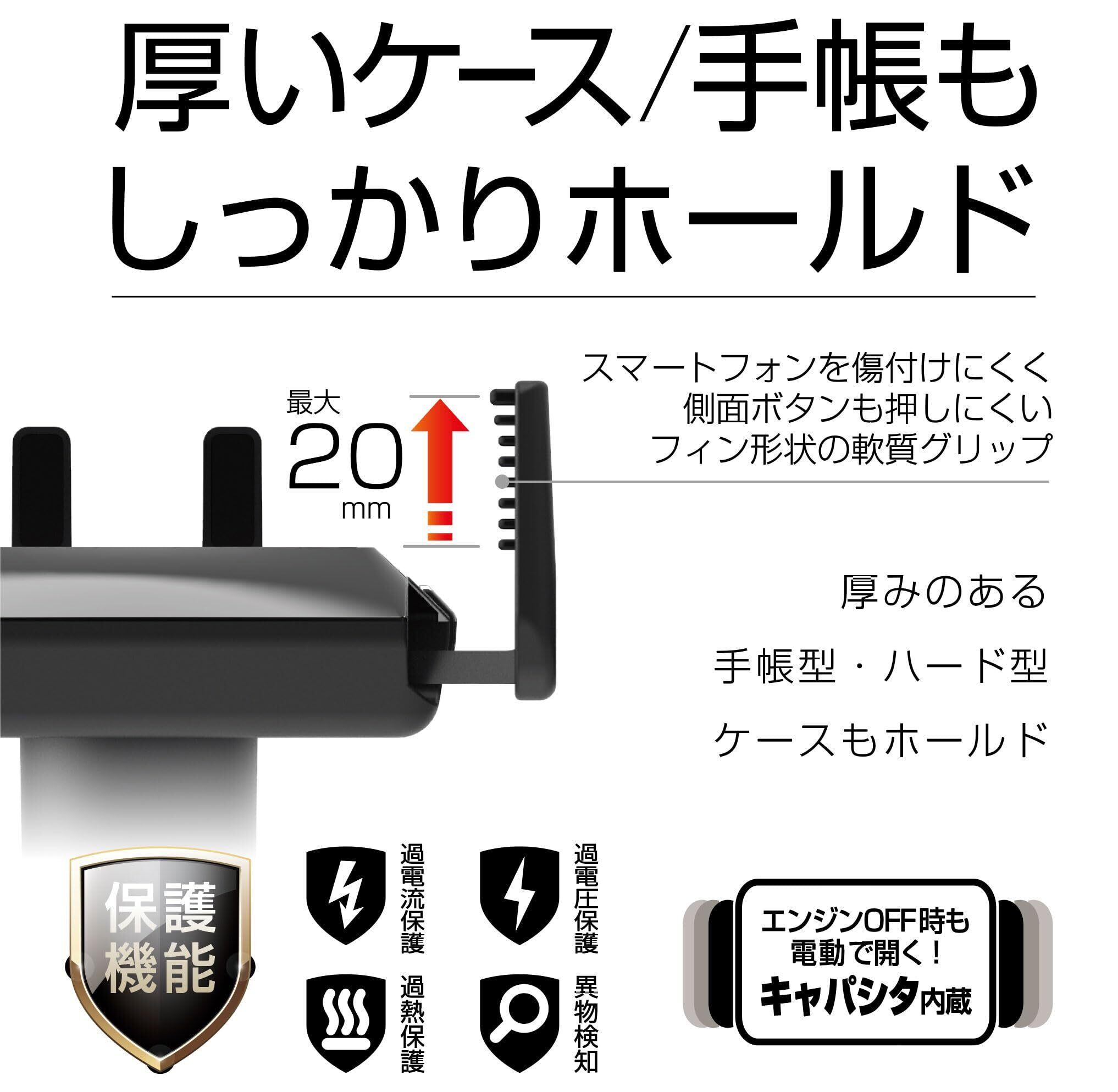 スマホをかざすと赤外線(近接)センサーが検知し自動で開閉してホールド、手帳型/ハード型ケースを装着した状態でもしっかりホールド&充電