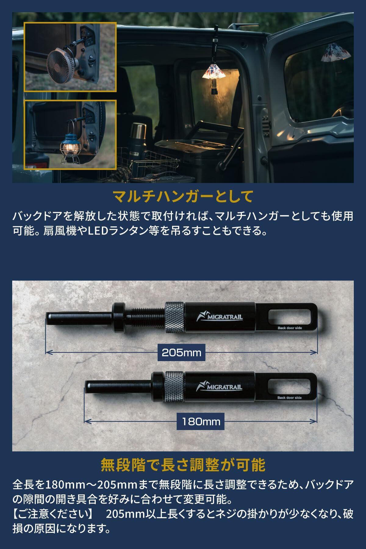 最小180mm~最大205mmまで無段階に長さ調整できるため、バックドアの隙間の開き具合を好みに合わせて変更可能。