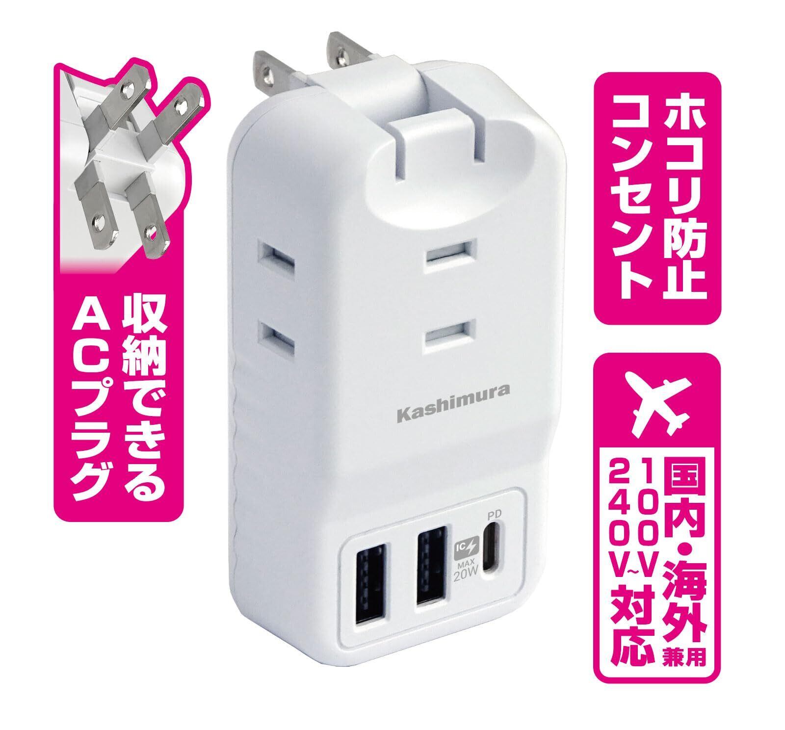 カシムラ 3コンセント-USB-A2口 USB-C1口 20W PD 自動識別 ホワイト リバーシブルUSB 100〜240V対応 NAC-035
