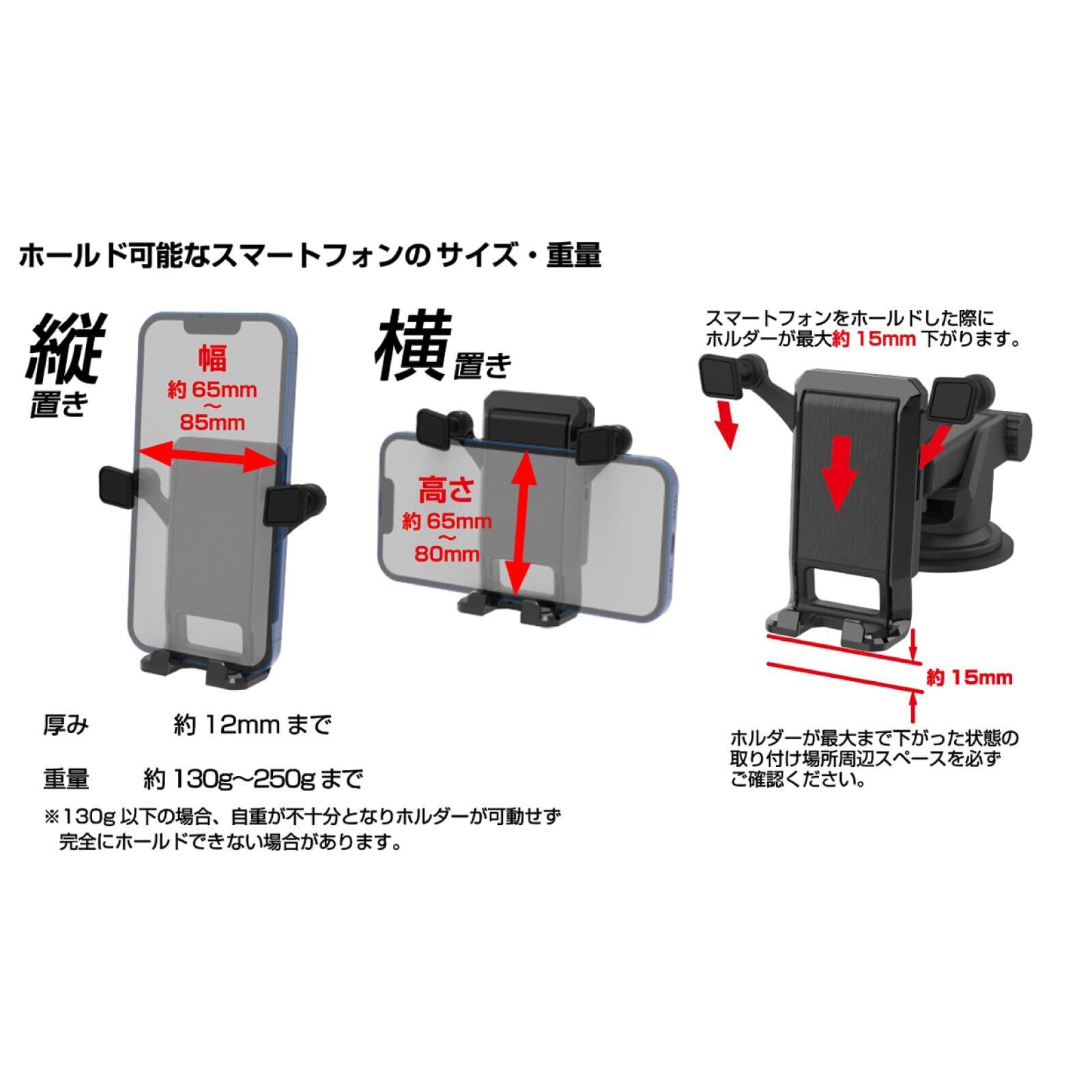 ※スマートフォンをホールドした際にホルダーが最大約15mm下がります。ホルダーが最大まで下がった状態の取り付け場所周辺スペースを必ずご確認ください。