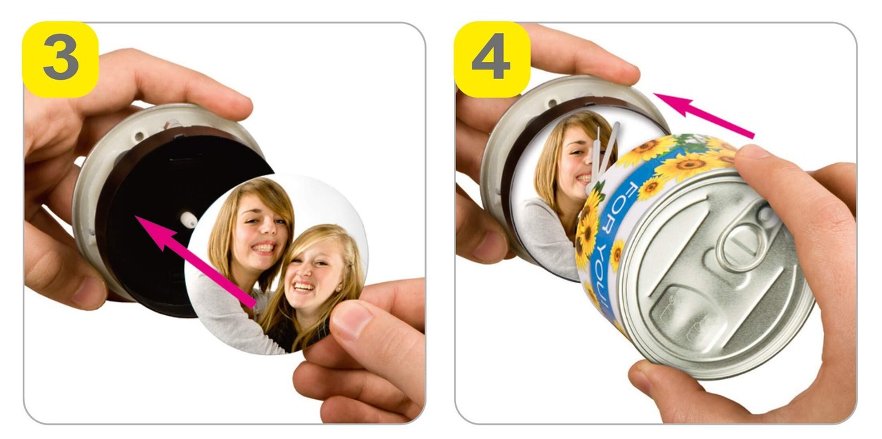 裏蓋をひねれば開閉が可能。時計の盤面にお気に入りの写真を入れたり、メッセージカードを挿入出来たりと、プレゼントとしても喜ばれるユニークな缶詰め型時計。