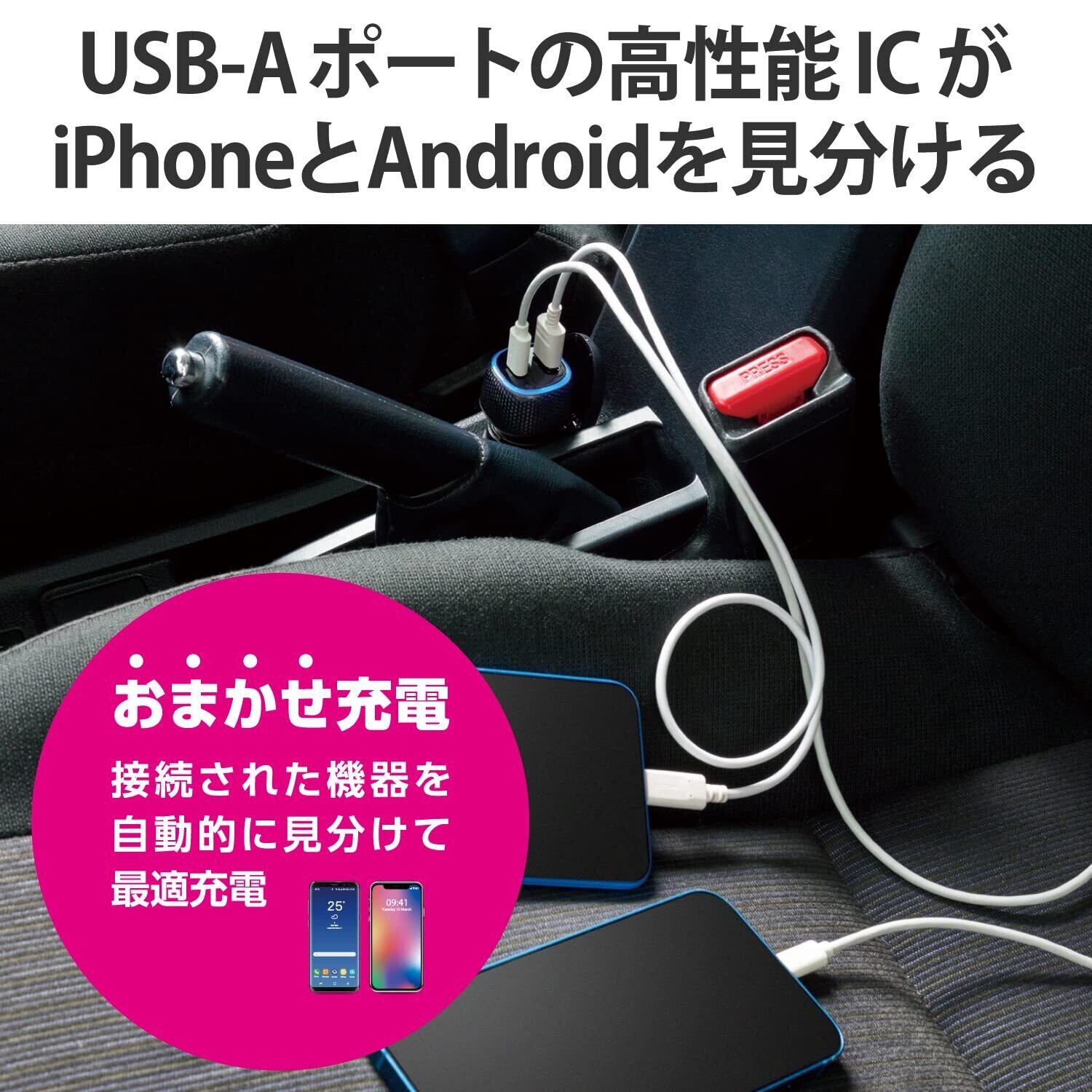 USB-Aポートに搭載した高性能ICがiPhoneとAndroid端末を自動で見分けて、適した出力で充電できる“おまかせ充電"に対応しています。