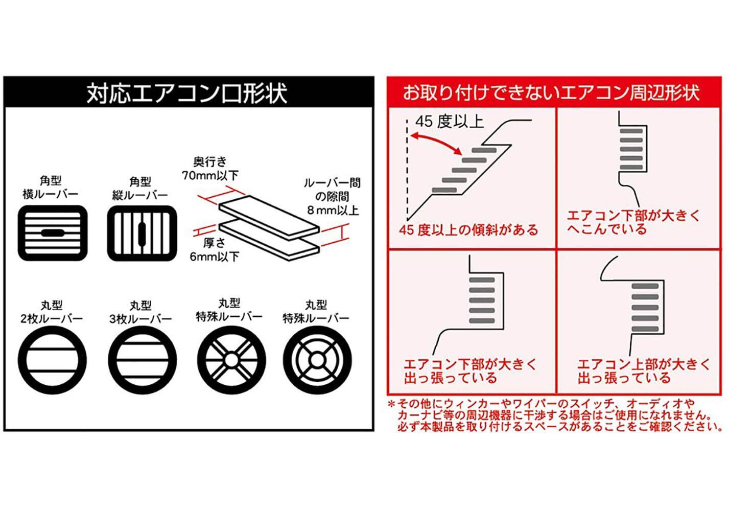 ●エアコンクリップは3種類の長さから選べ、角型ルーバーから丸型ルーバーまで幅広く対応します。