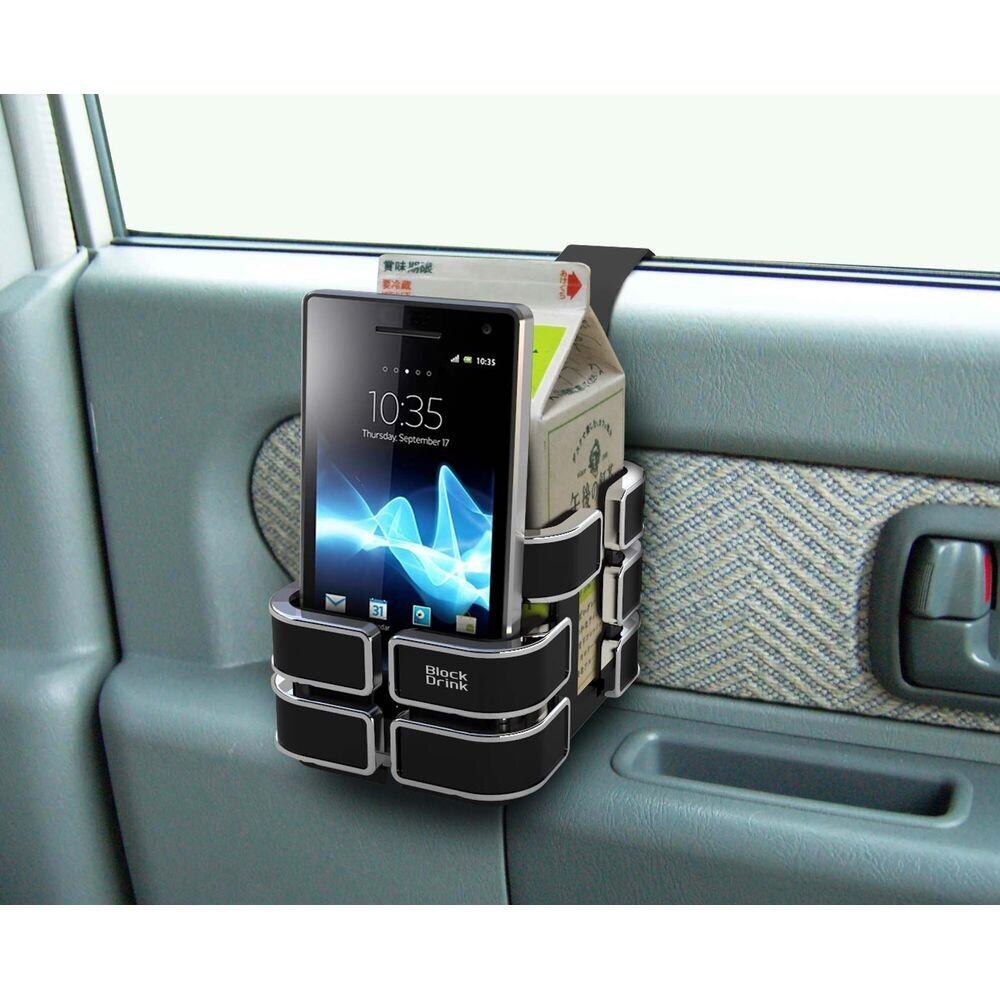 ●前面スライド構造でスマートフォンやタバコを置くことができるドリンクホルダー。