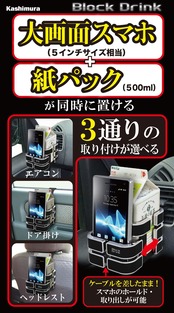 ●付属パーツと両面テープを使って、エアコン吹き出し口、ドアサイド、ヘッドレスト、3通りの取り付けができます。