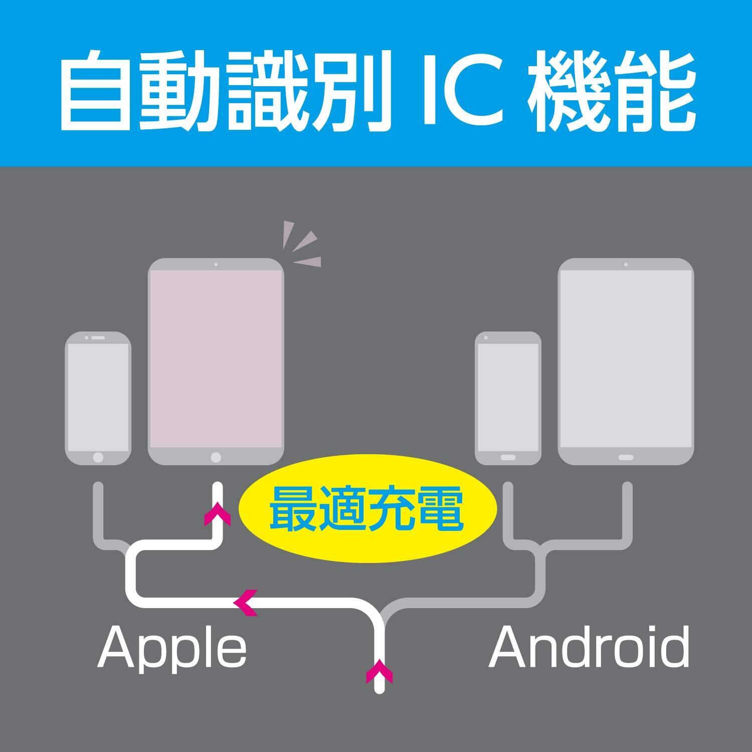 【USB出力はスマートIC機能搭載】スマホやタブレット等、接続機器を自動に識別し、それぞれの機種に最適な電流値で充電することができます。