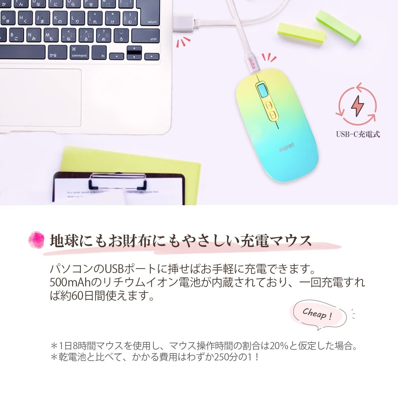 Bluetooth&2.4G、充電式静音ワイヤレスマウス、3台PC対応、3段DPI、かわいい、おしゃれ、グリーン、イエロー、 EGRET PrettiE (萌黄) EM23-P3