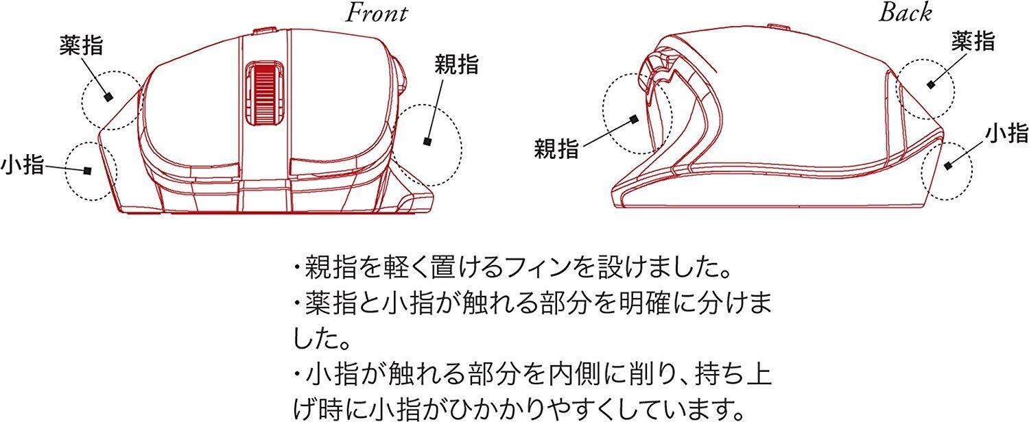 ・親指、薬指、小指が自然にマウスを掴める形状を追求。小指がフィットして、操作しやすくなっています。