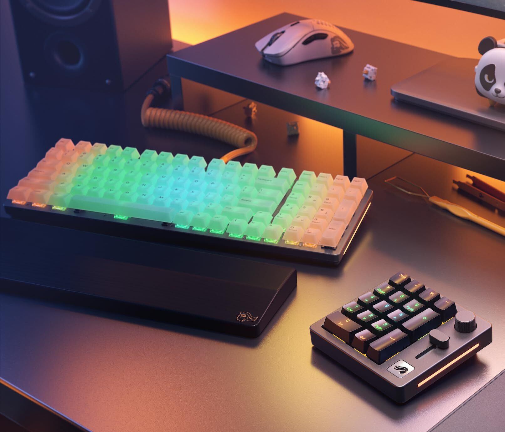 RGBバックライトが透過する半透明キーを採用、耐久性の高いポリカーボネート製のキーキャップ。