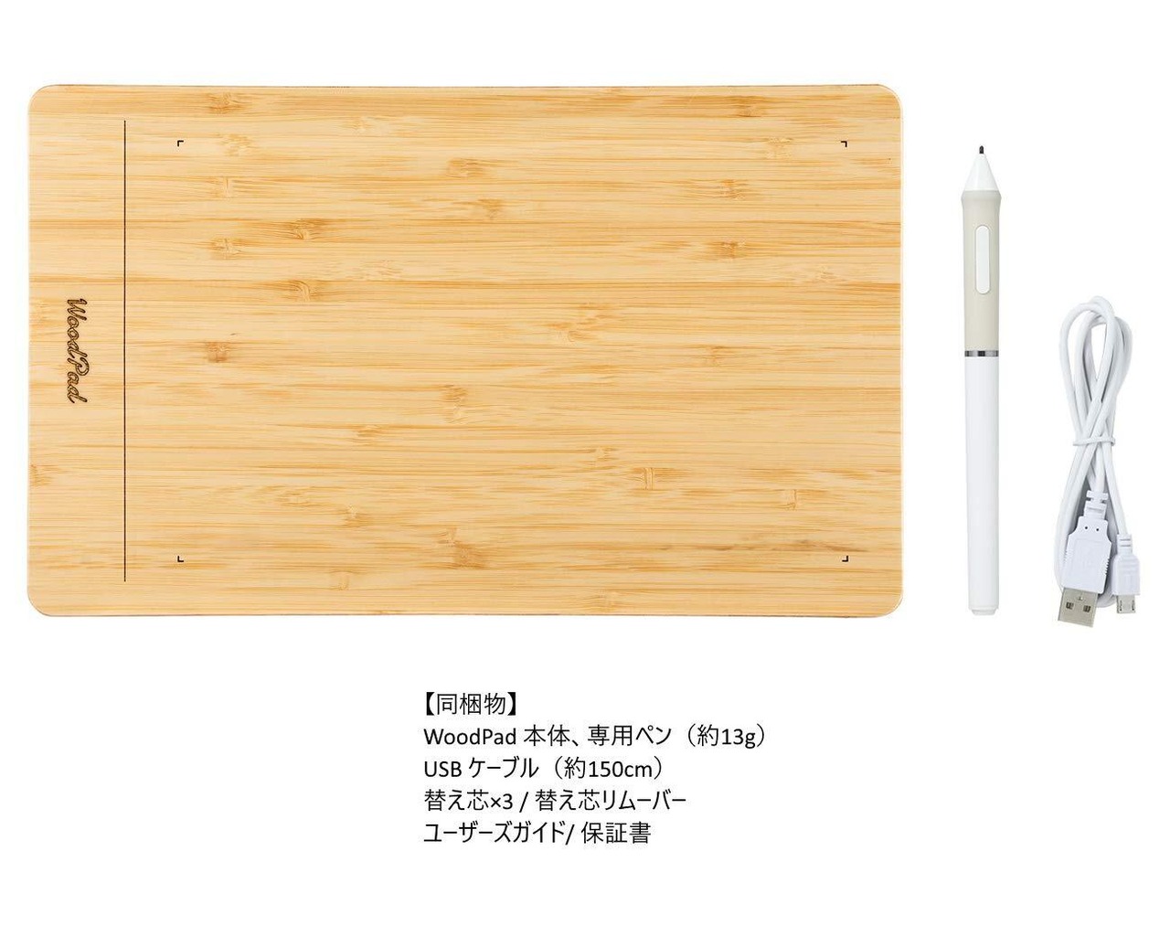 WoodPad本体、専用ペン(約13g)、USBケーブル(約150cm)、替え芯×3、替え芯リムーバー、ユーザーズガイド/保証書