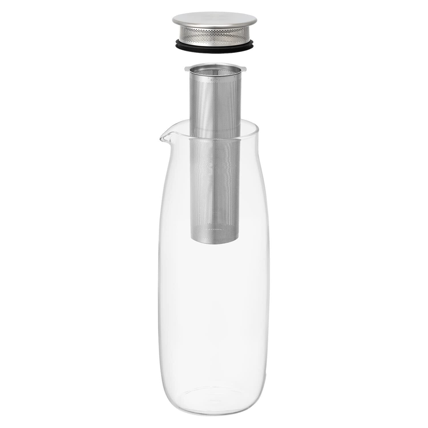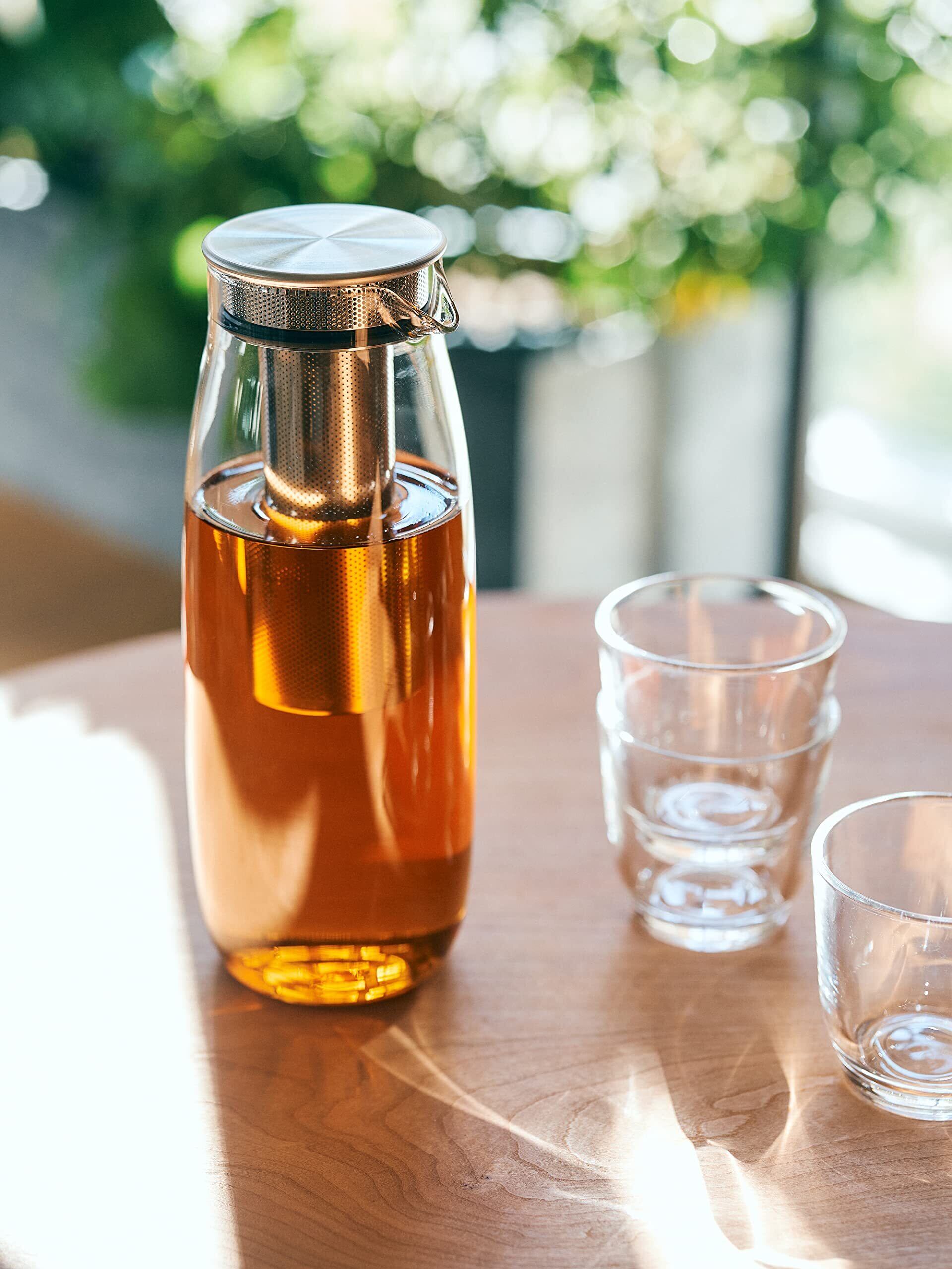 冷蔵庫のドアポケットに収まるサイズで、蓋は注ぐたびに開け閉めする必要がなく、氷やレモンなどを留めながら注げる設計です。付属の細かいメッシュストレーナーに茶葉を入れて水を注ぐだけで、水出しのアイスティーを手軽に作ることができます。