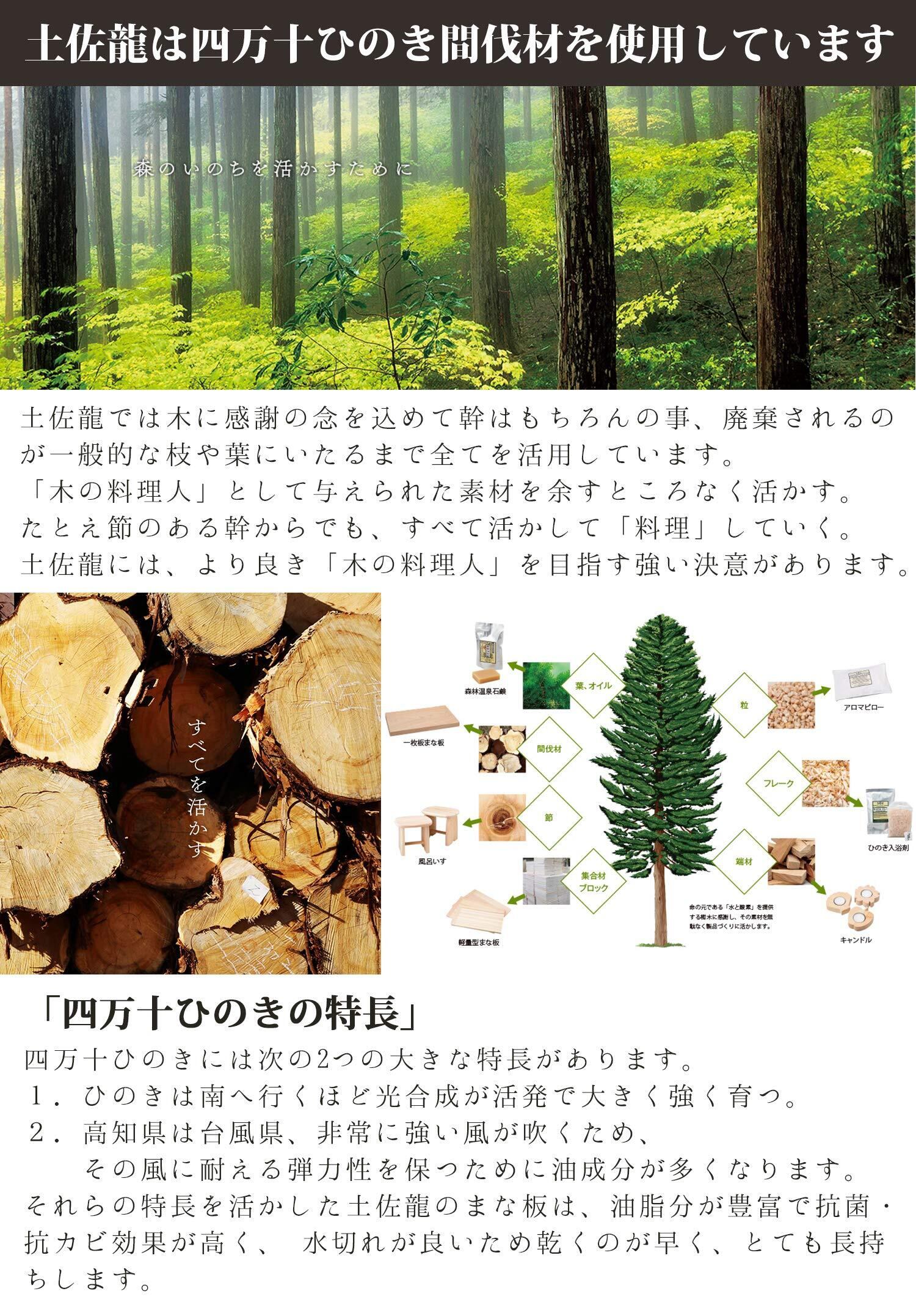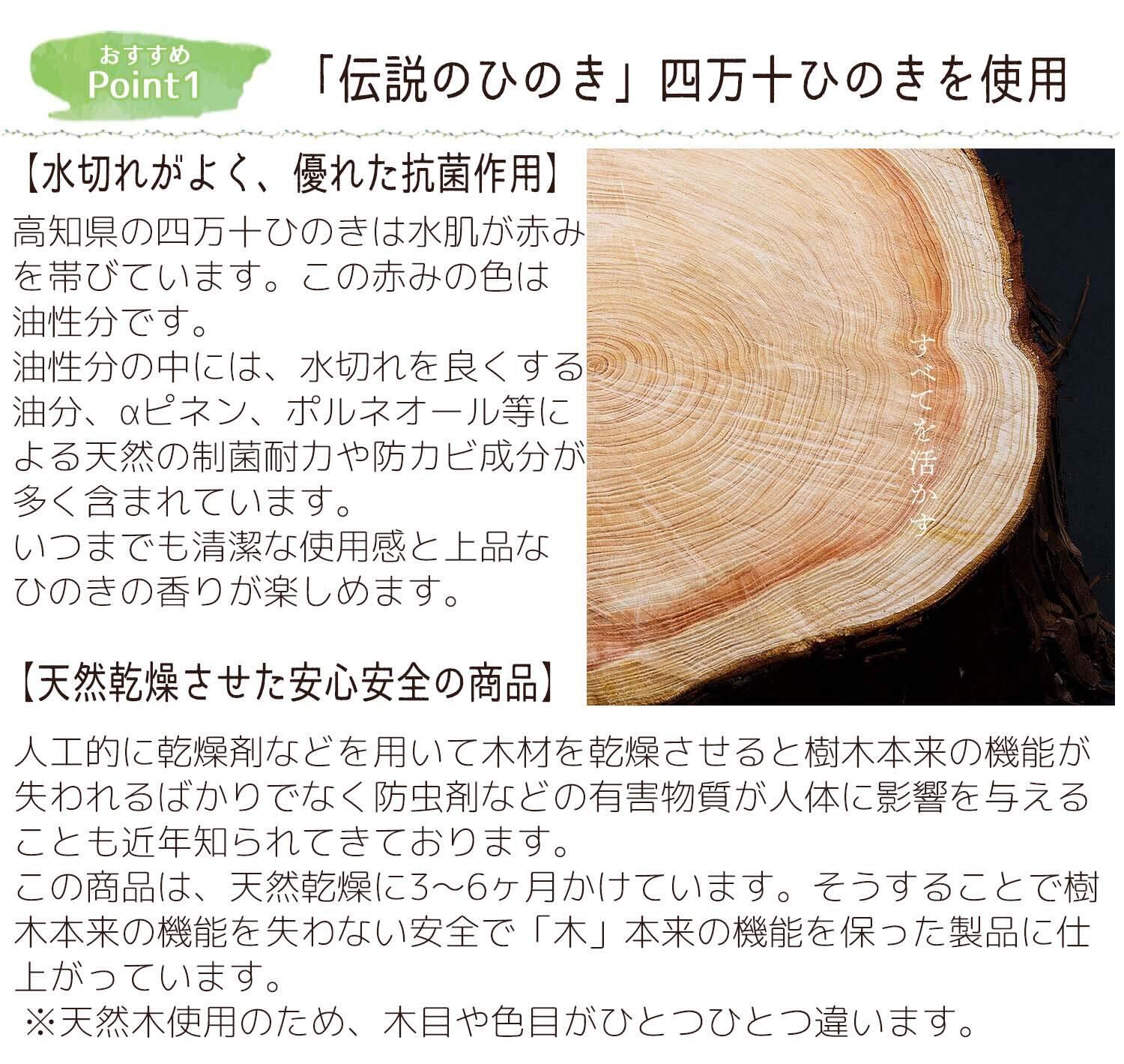 四万十ひのきは、ひのきの中でも特にオイル成分を多く含むため、抗菌作用が高く、カビや雑菌、ウィルスの繁殖を防ぐ。乾燥に強く、水切れも良いので、清潔に使える。水切りに便利なスタンド付