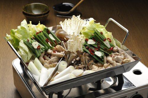 ●正方形の鉄板でホルモンや野菜を煮込む鍋