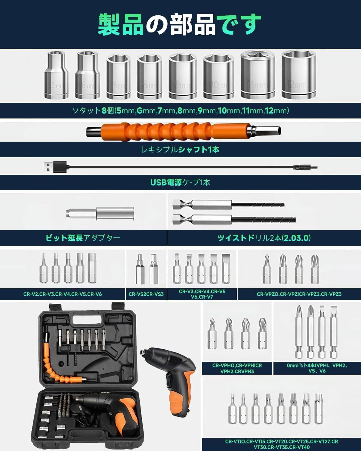 「充実した付属品とサポート体制」異なるサイズや形状に対応する40種類以上のビットが含まれており、DIYを楽しむために必要なほぼすべてが揃っています。また、購入後のサポートも充実しており、経験豊富なスタッフが365日対応しているため、万が一の故障や不具合にも迅速に対応いたします。安心して長くご利用いただける環境を整えています。
