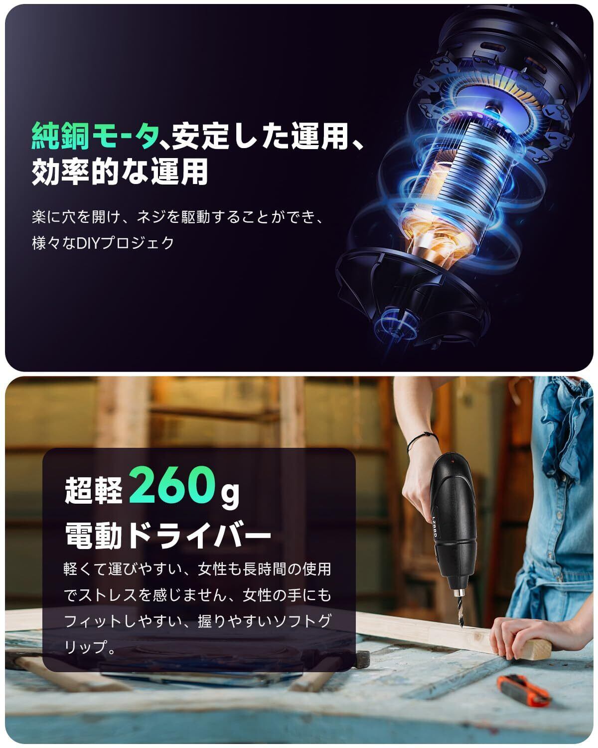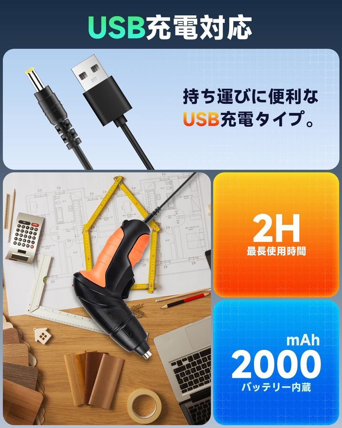 「コードレス設計で快適な作業を実現」USB充電式の電動ドライバーは、電源のない場所でも気軽に利用可能です。バッテリーの持続時間は120分以上と長く、作業効率を向上させます。アウトドアやリフォーム作業など、さまざまな環境での使用に最適な選択肢です。