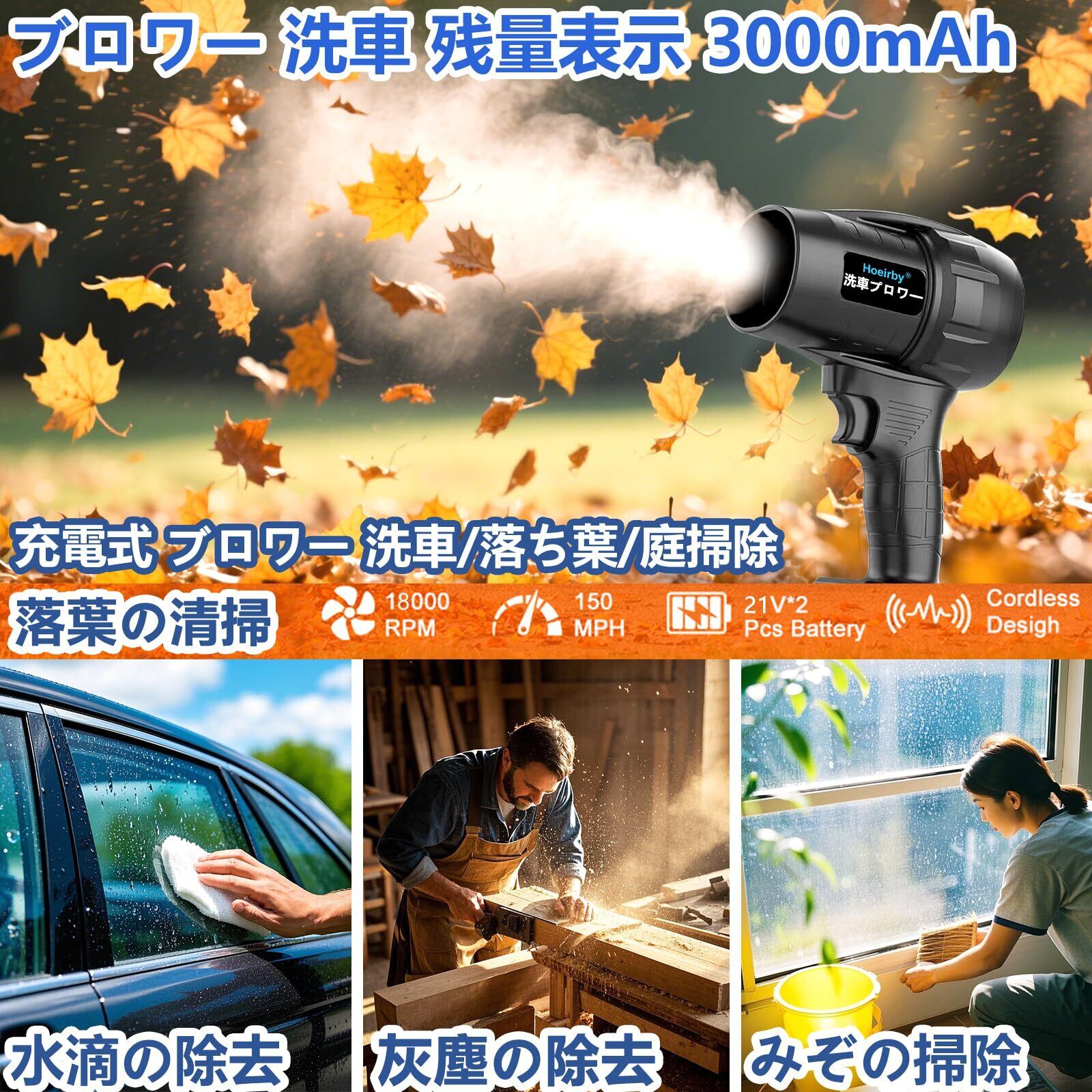 【タキタキ工具店監修・24時間アフターサービス対応】Hoeirby家庭充電式 洗車 ブロアーは、全世界で300万人以上の消費者にサービスを提供しています、品質は信頼できます。当社は12個月の保証期間を提供し、専門的な日本語の取扱説明書も付属しており、簡単に使いこなせるようサポートいたします。パッケージ内容には、ブロアー本体、2x3000mAh PSEバッテリー、充電器、収納ケース、日本語の説明書が含まれています。エアダスターは出荷前に厳格な品質管理を行っておりますが、万が一お届けしたエアダスターに不具合が発生した場合、「注文履歴」ー「出品者に連絡」から弊店までご連絡ください。24時間に日本ローカル対応できる、スタッフはいつでもご連絡をお待ちしております。
