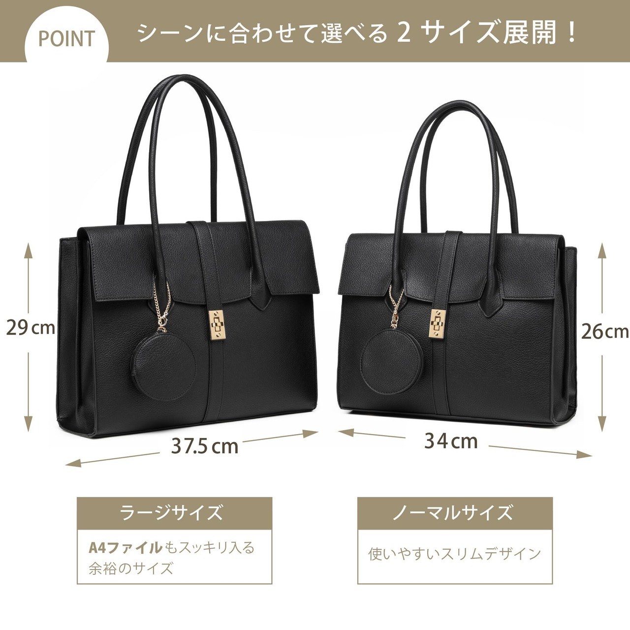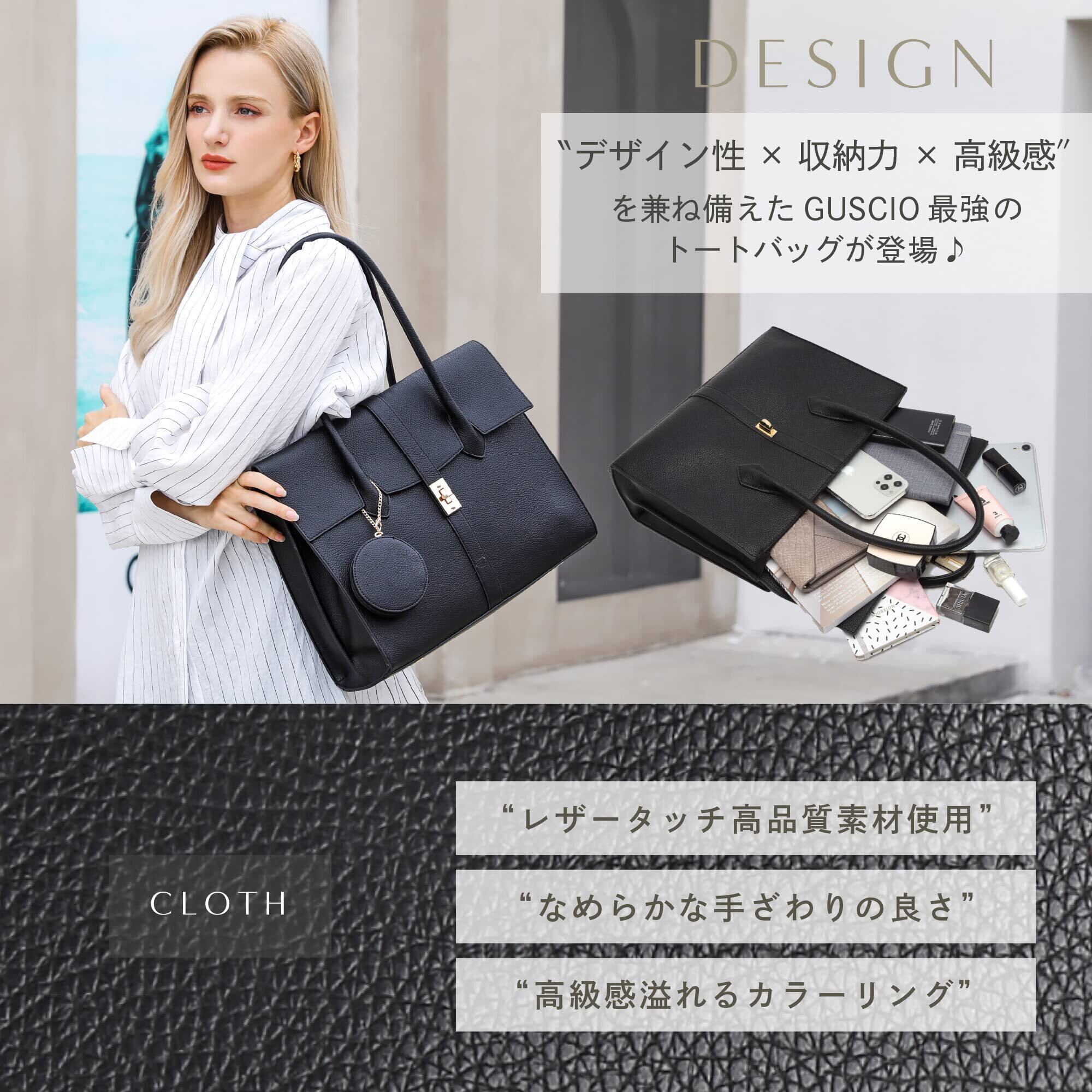 ①デザイン性×収納力×高級感〞を兼ね備えたGUSCIO最強トートバッグが登場②エレガンスなデザインでデイリーに万能なトートバッグです③ワンランク上のコーデの仕上げにプラス!④レザータッチ高品質フェークレザー使用で、高級感が溢れます。⑤A4サイズを納める大きめの容量があり、オンにオフに大活躍できます。スーツとの相性も良く働く女性にもピタッリ。