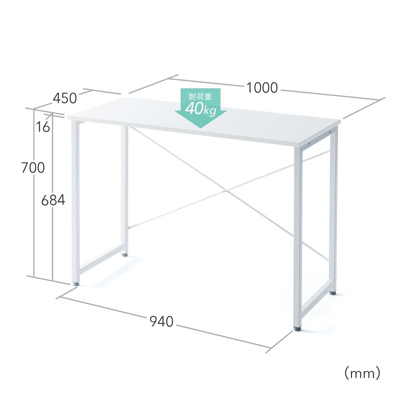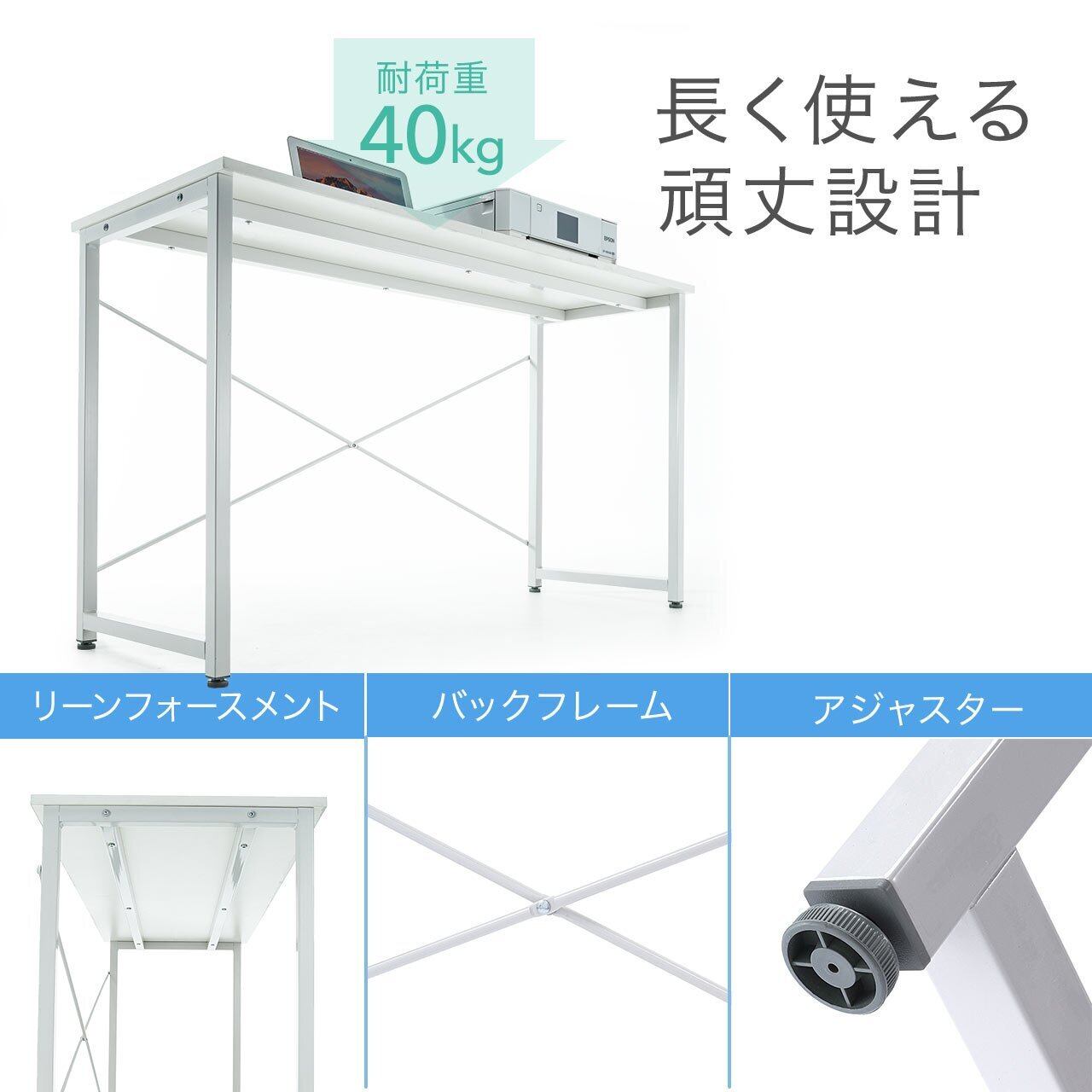 耐荷重が40kgあるので、パソコン本体やプリンタ等を並べて設置することが出来ます。横揺れを防ぐバックフレーム(筋交い)を採用しています。