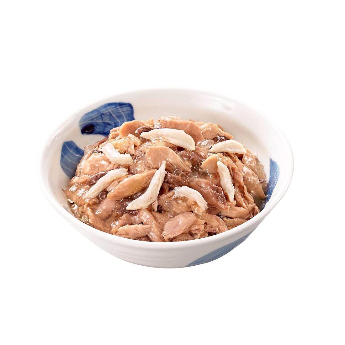 【原材料】 魚介類(カツオ、マグロ)、鶏ささみ、オリゴ糖、増粘多糖類、調味料、ビタミンE 【保証成分】 たんぱく質6.6%以上、脂質0.2%以上、粗繊維0.1%以下、灰分1.8%以下、水分92.4%以下 【エネルギー】 26kcal/1袋(60g)