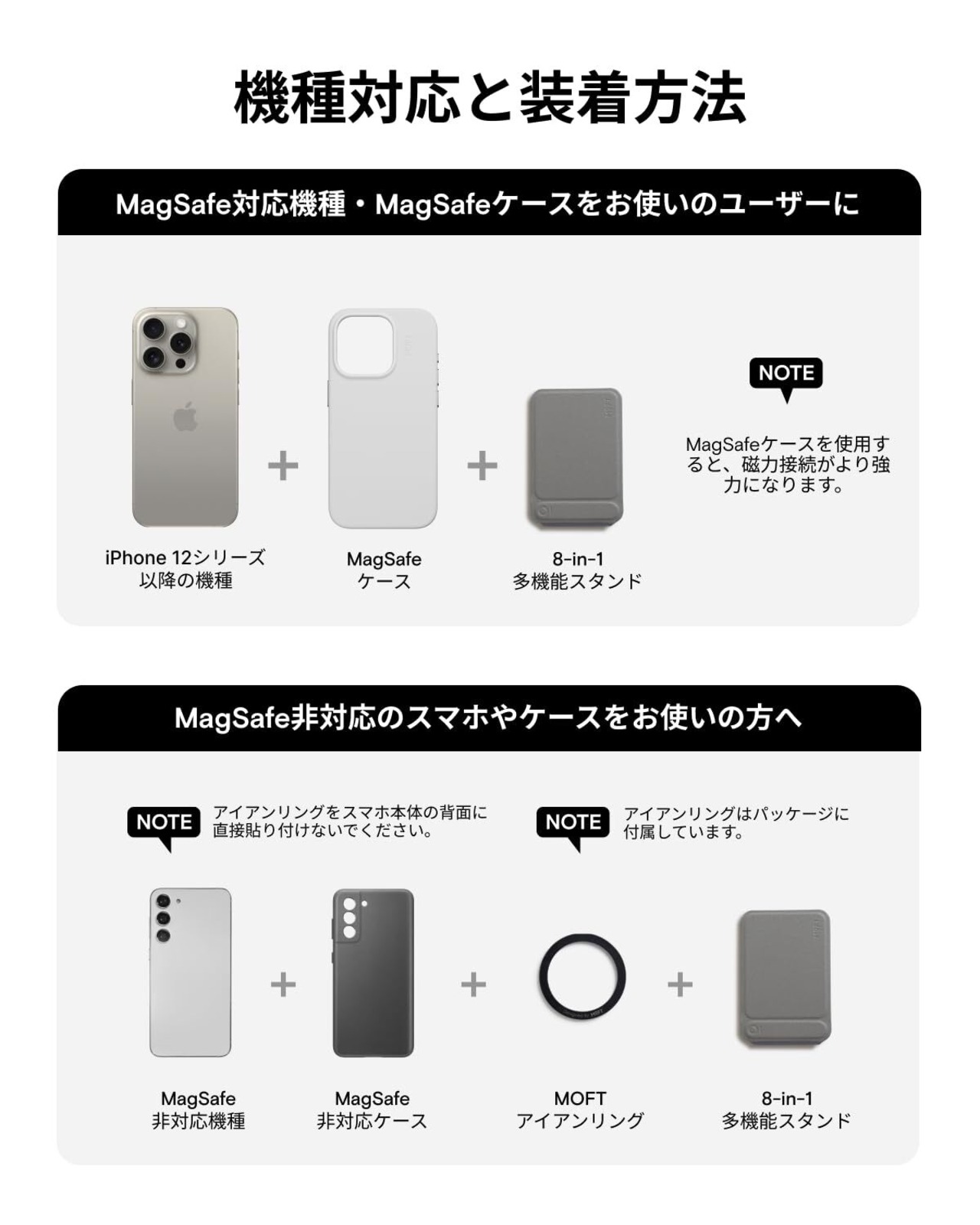 【アイアンリング付き・全機種対応】この携帯スタンドは iPhone 16/15/14/13/12シリーズ(Pro/Pro Max/Plus/Mini含む)に対応。。背面にマグネットが付いていないスマートフォンも、付属のアイアンリングをスマートフォンケースに取り付けるだけで、MOFT 8-in-1多機能スタンドを使用できます。 製品にはマグネットリングが付属しています。取り付け方法については、詳細ページの動画をご参照ください。【注意:粘着面がある側はスマホケースまたはスマホの背面に貼り付けてください。スタンドには貼り付けないでください。】