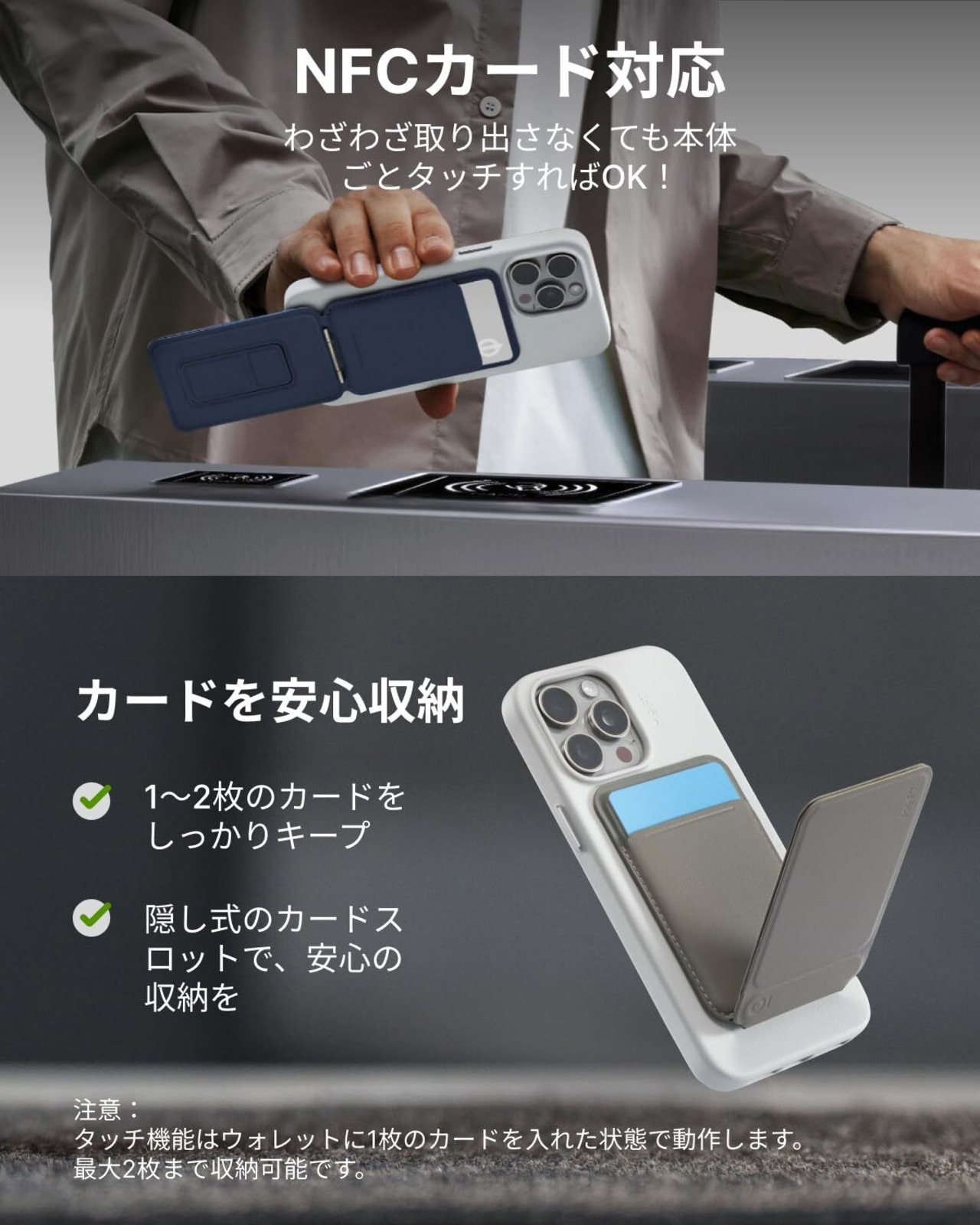 【NFCカード対応!かざすだけでアクセス】マイナンバーカードや運転免許はもちろん、お札や名刺、Suicaなどの交通系ICカードやタッチ決済に対応したクレジットカード、カードキーまで収納可能。カバンから取り出す手間なく、本体ごとタッチするだけでスムーズな決済が可能です。カードケースには1~2枚のカードまで収納できますが、NFC機能を使用するためには、カードを1枚だけ入れてください