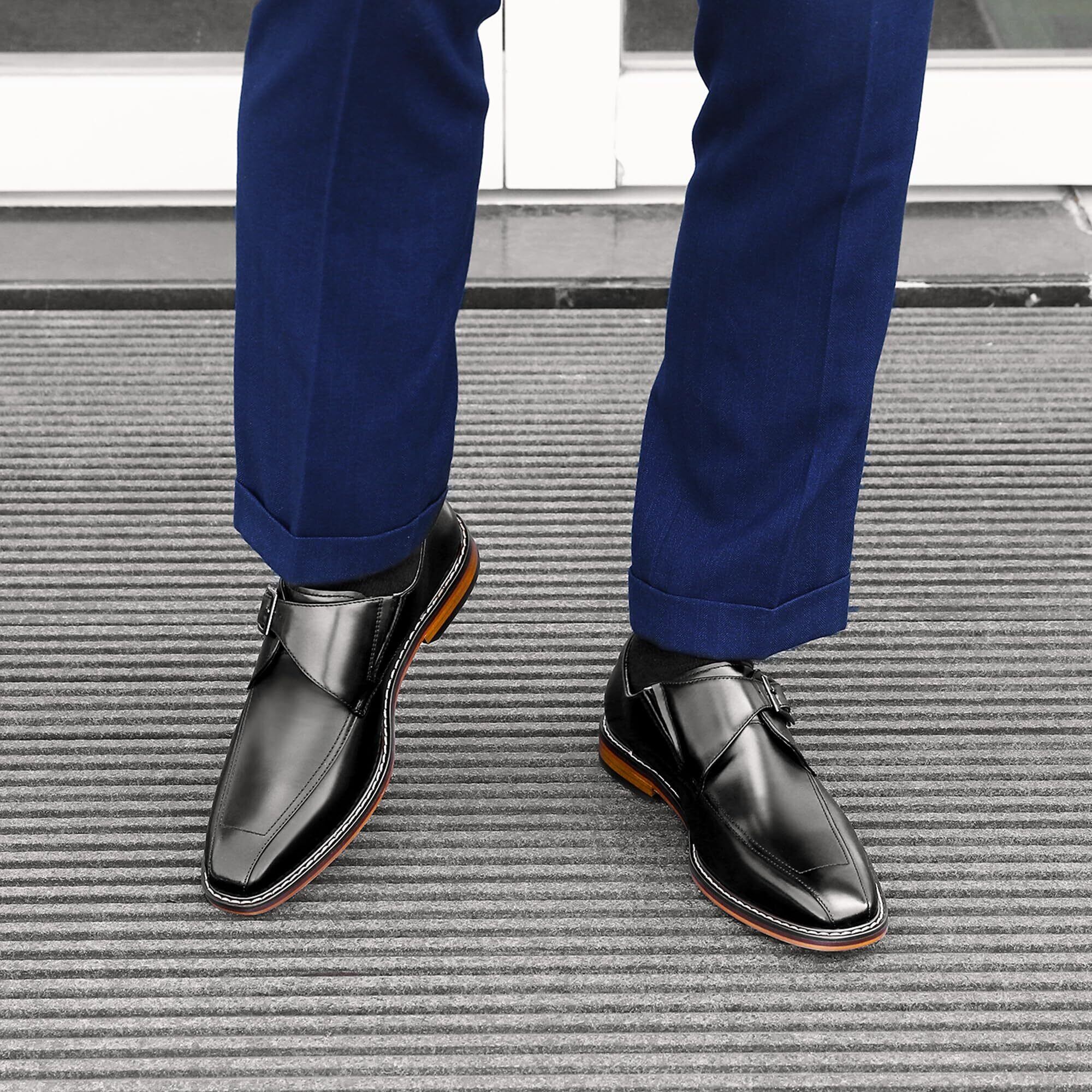 モンクストラップのモンクストラップ部分のアクセントはおしゃれで、ダブルストラップは開けなくでも、履き脱ぎは楽チンなビジネスシューズです。モンクストラップの特徴としては、 リーズナブルで丈夫で、デザインもまあ綺麗で、実用性が高い!