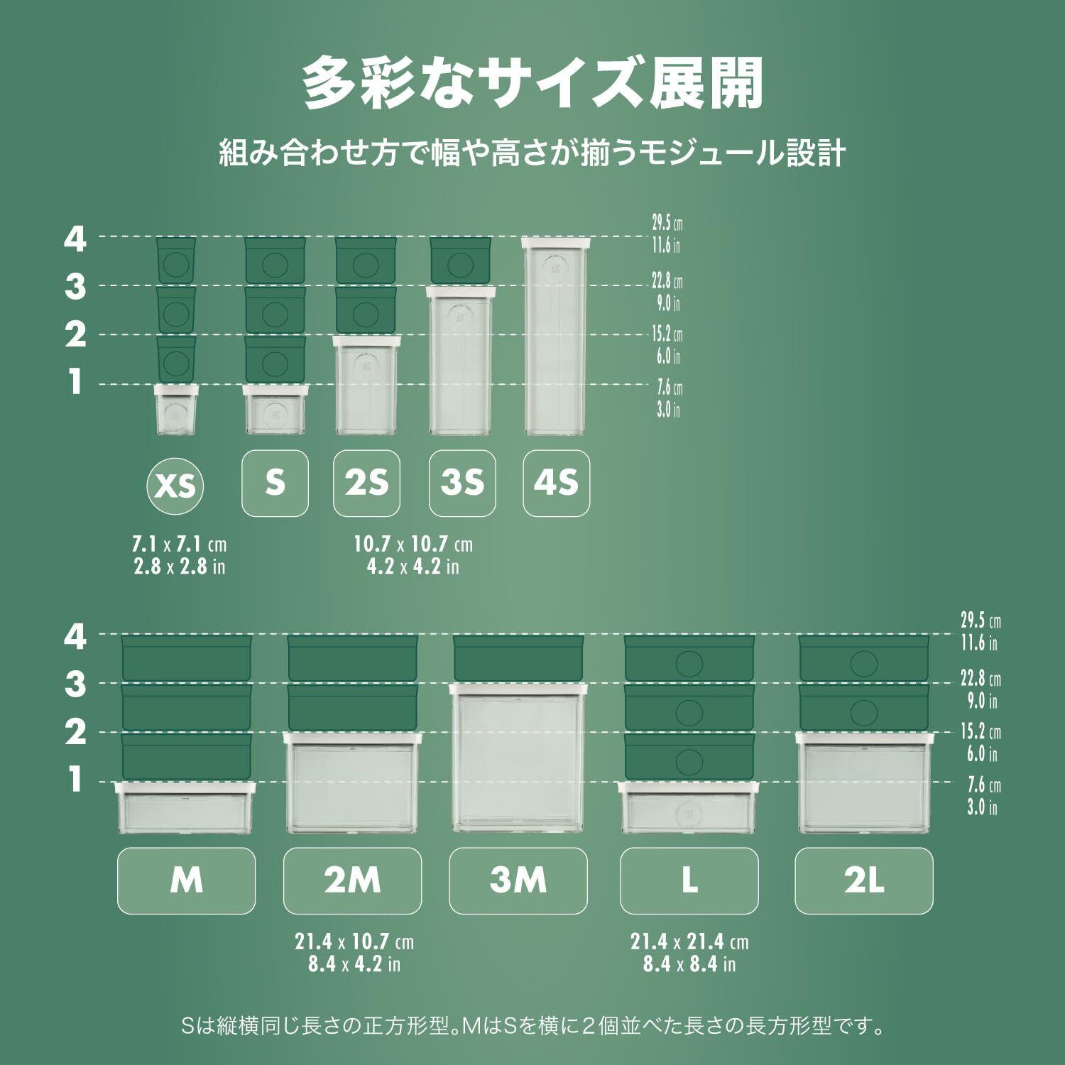 【 キッチンのあらゆる場所にフィット 】 8サイズ展開で、引き出しやシンク下収納にもピッタリ。上から中身が確認できるシースルー蓋で、ストック管理も簡単!
