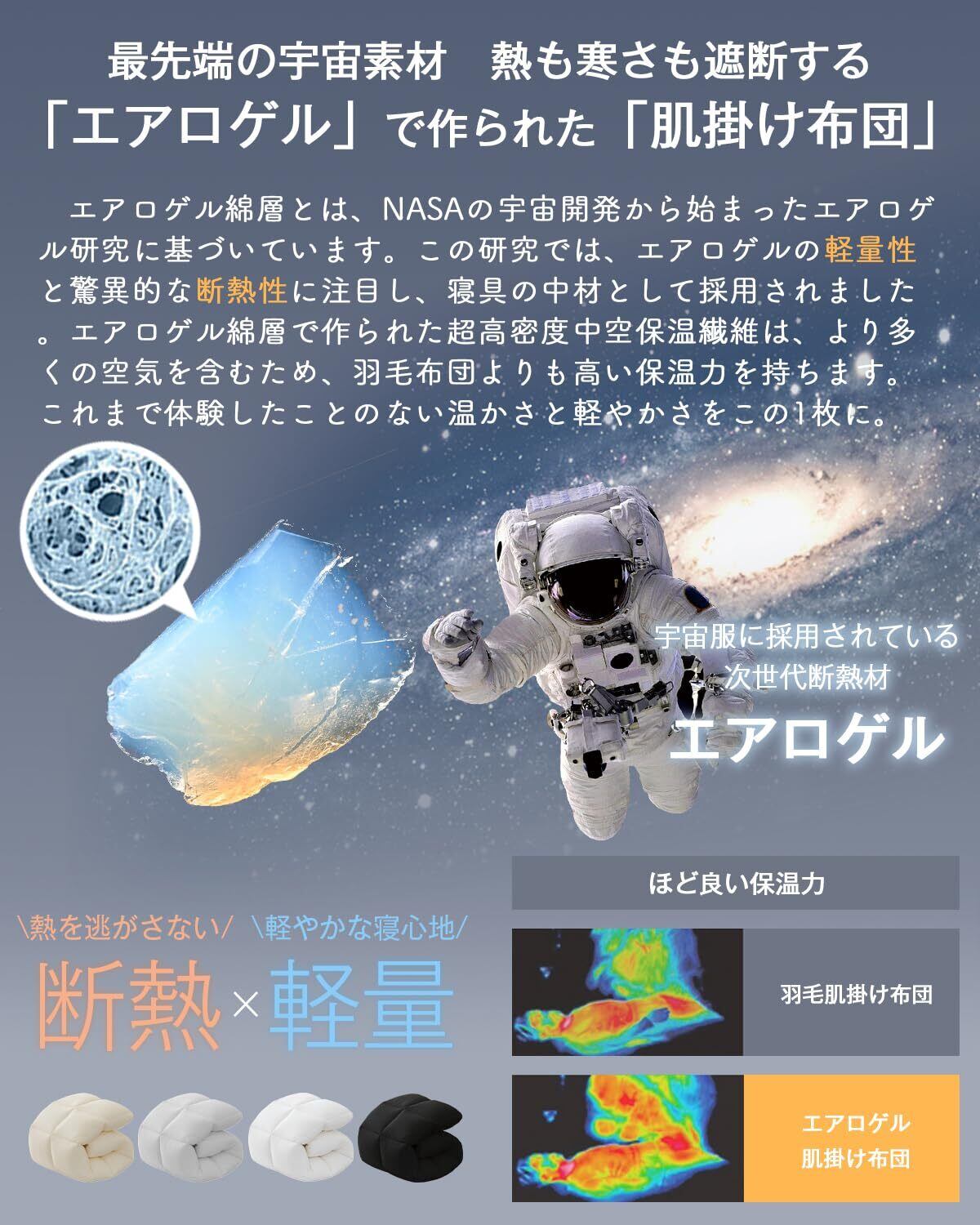 【宇宙服素材エアロゲル採用・軽量&高断熱】極小のナノファイバーが真空層を形成する「エアロゲル繊維」は、宇宙服にも採用されるほどの次世代断熱素材。驚くほどの軽さで高い断熱性を発揮し、外の冷気をシャットアウトしながらも、適度な通気性で湿気を逃がします。羽毛布団を上回る保温力で、良質な睡眠をサポートします。