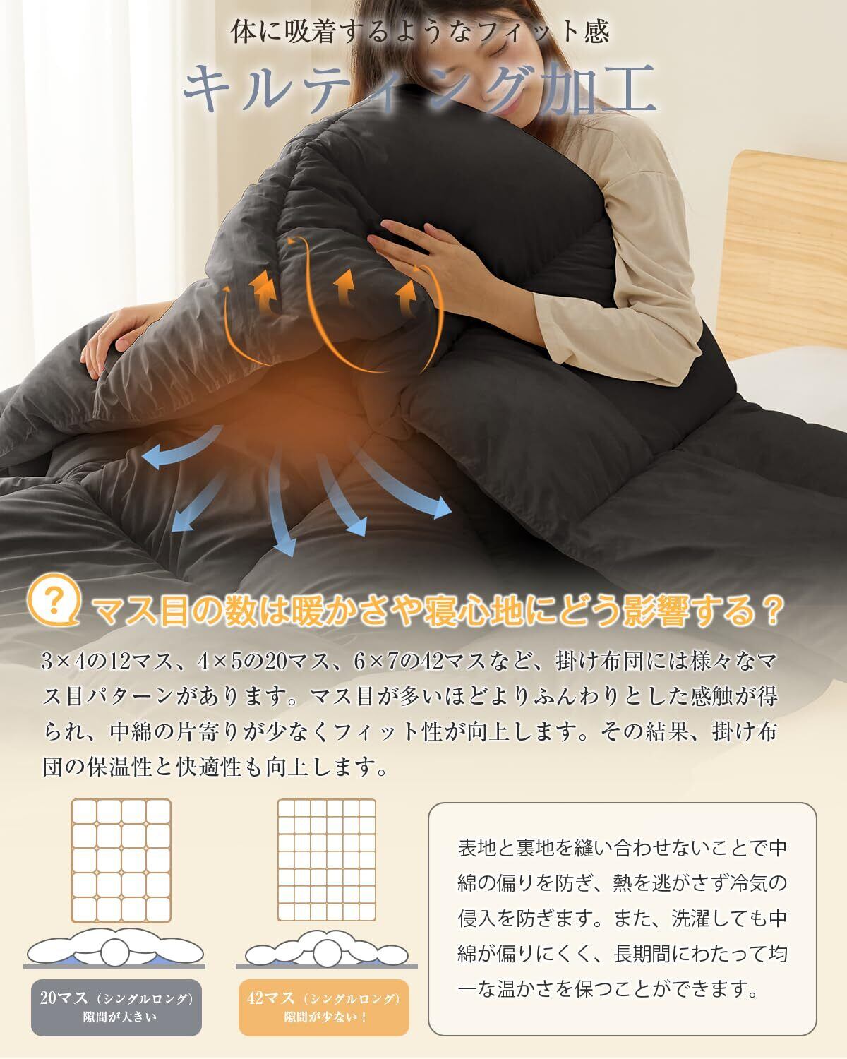 【通年用人工羽毛布団・商品仕様】「サイズ」シングル:150×210cm セミダブル:170×210cm ダブル:190×210cm ※キルティング製(許容範囲+5%,-3%)「側地」 ポリエステル100% 「中材中綿」帝人FWALINE50% エアロゲル50% 「ループ」8箇所付き 「企画国」日本【ご注意】お客様のご覧いただく環境により、色合いなどが異なる場合があります。実物とは色合いや明るさなどに相違が生じる可能性があるため、ご了承ください。万が一、商品に不具合がございましたら、お気軽に弊社までご連絡ください。迅速に対応させていただきますので、ご安心してお買い求めください。