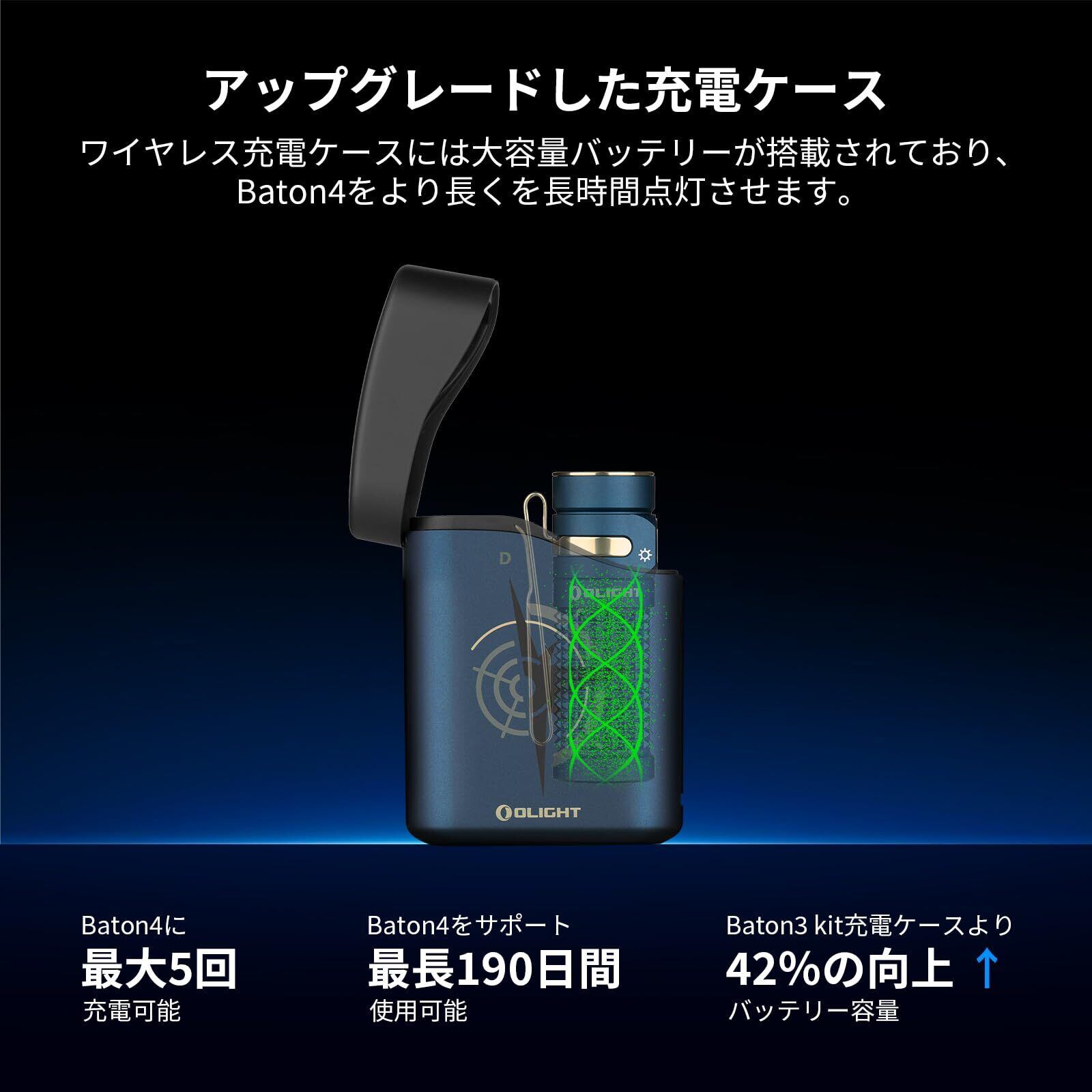 {1300ルーメン高輝度照明+最長190日間稼働} OLIGHT Baton 4の最大輝度は1300ルーメンで、アウトドアでも十分の明るさを提供でき、170mの最大射程に達し、緊急用、防災用、停電対策、日常生活などの様々なシーンにご適用しています。Baton 4 Kitはワイヤレス充電ケースも付っています。充電ケースには内蔵された高品質専用バッテリーの容量は 42% 増加されるし、Baton 4を5回ぐらい充電させます。充電ケースでBaton 4の使用時間が大幅に延長され、月光モードで最長190日間使用できます