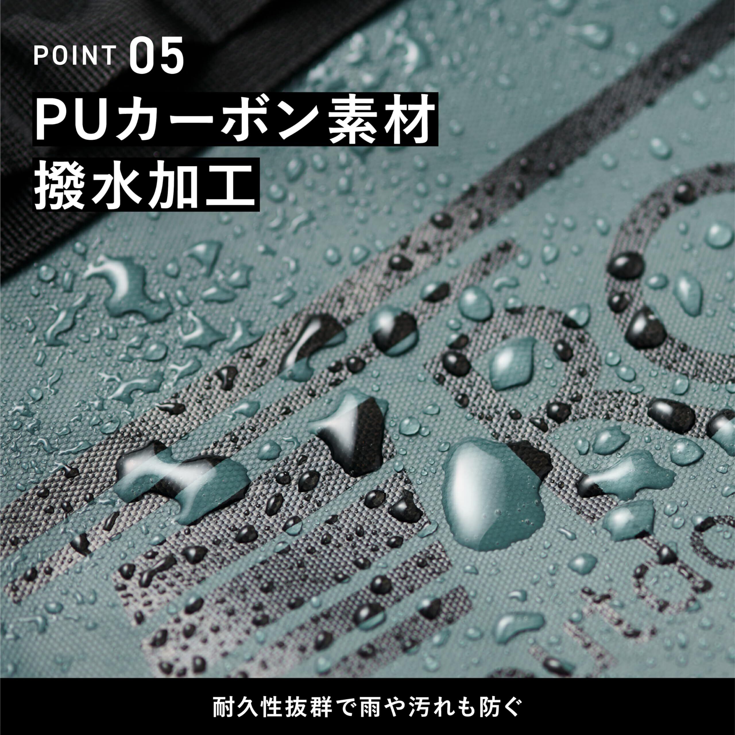【PUカーボン素材による撥水加工+耐久性】撥水仕様のポリエステル素材と丈夫なフラップで 急な雨でも安心。耐久性抜群のPUカーボン素材なので、スポーツやアウトドアシーンでも タフにお使いいただけます。