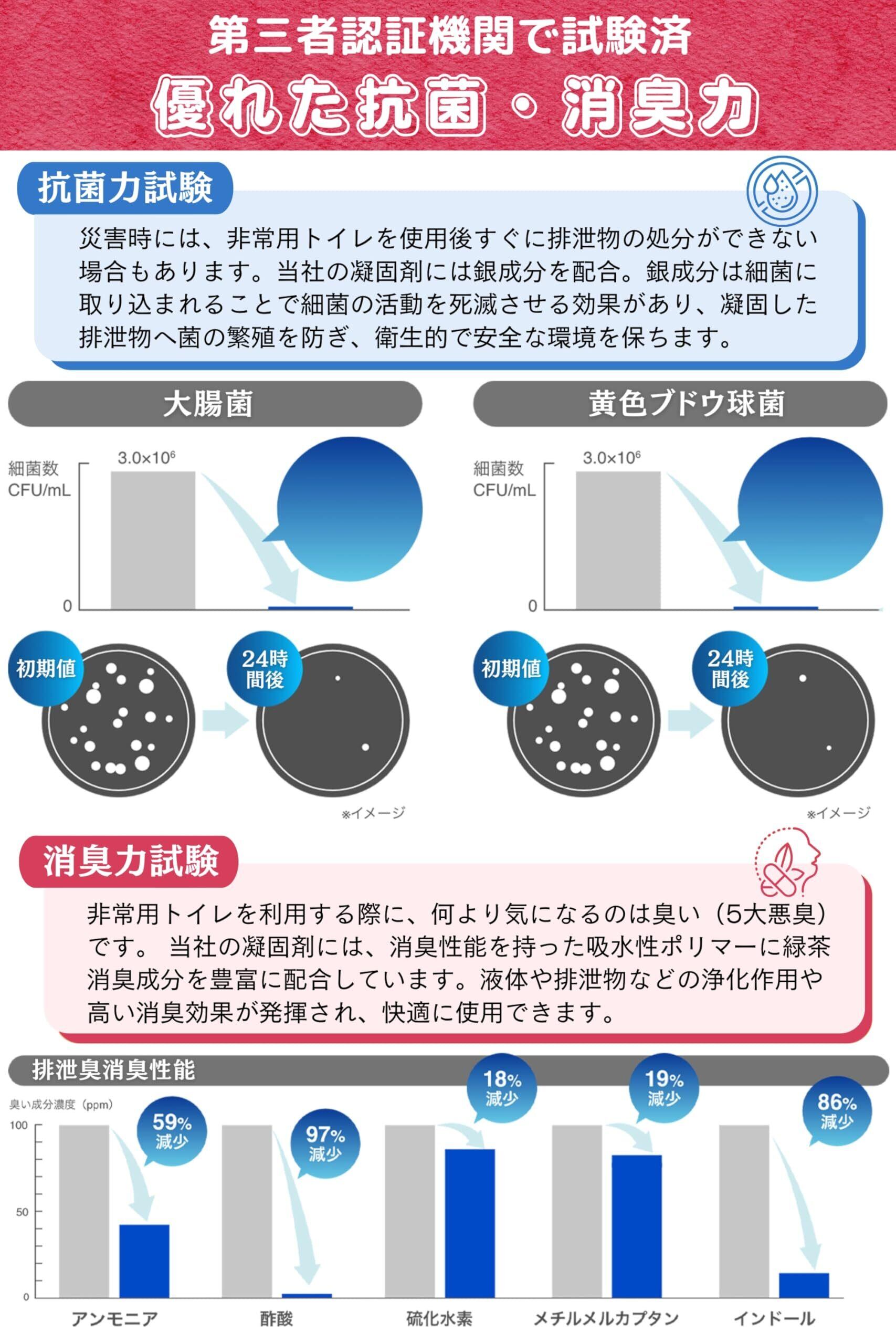 【抗菌99.9%・消臭97.8%|非常時の不快感を軽減】 排泄物のニオイや雑菌は、非常時における大きなストレス要因。 本品は、銀イオンによる抗菌加工で99.9%の菌の繁殖を抑制し、緑茶成分がアンモニアなど5大悪臭を97.8%中和。従来品に比べ消臭効果の持続時間も30%向上しました。防災トイレとしてはもちろん、停電・断水・介護・渋滞など、トイレにすぐ行けないさまざまな場面でも、携帯トイレとして安心してご使用いただけます。