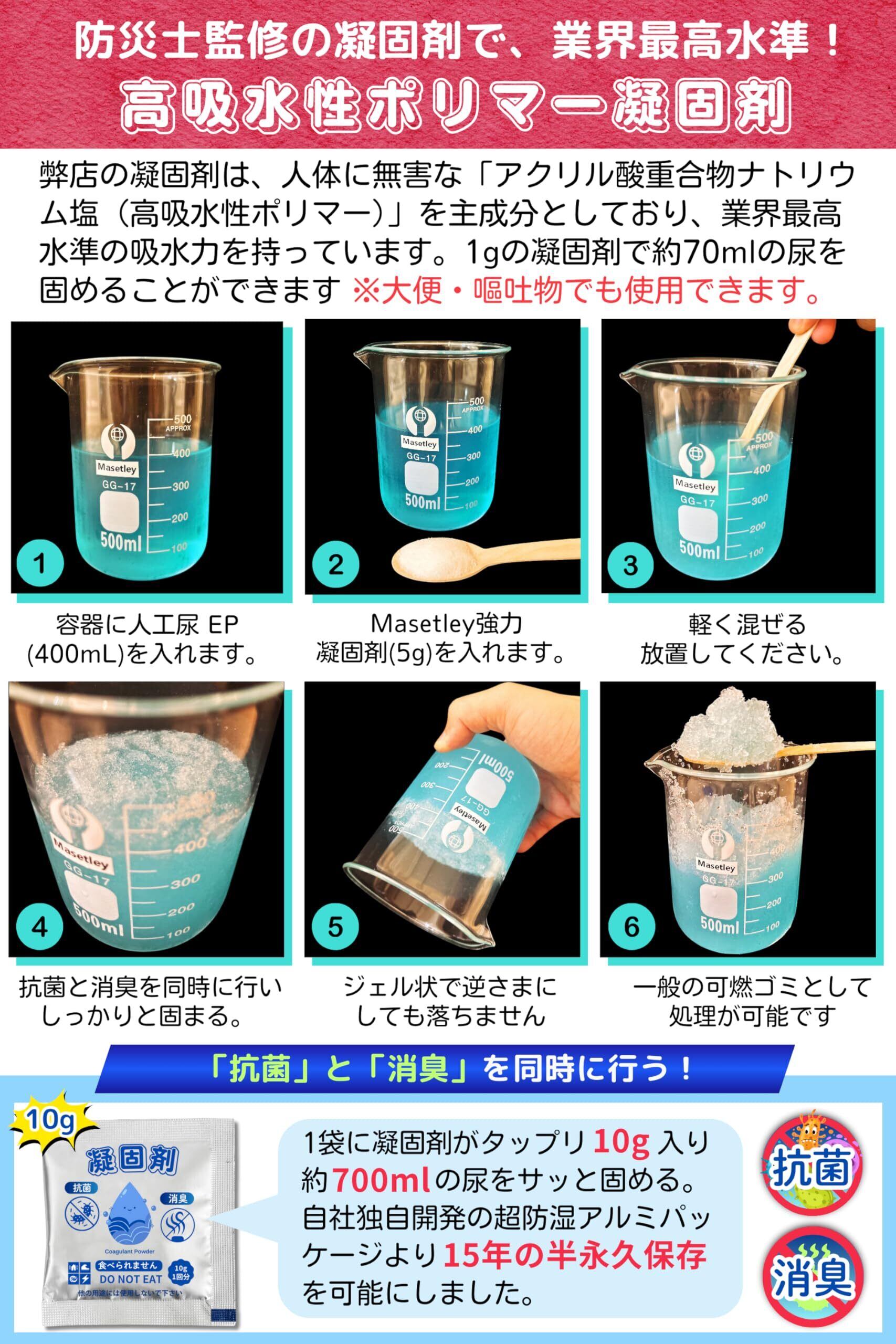 【700ml対応・2倍吸収|高性能凝固剤で清潔処理】凝固剤には、人体に無害な「高吸水性ポリマー(アクリル酸ナトリウム塩)」を使用。1包(10g)で最大700mlの液体をゼリー状に固め、従来品の約2倍の吸収力を実現しました。断水時や避難所などでも、簡単トイレとして清潔かつ安心してご利用いただけます。