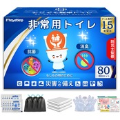 【非常時に安心を備える|簡易トイレ80回分セット】突然の災害や断水、停電時に防災用品として備えておきたい「非常用トイレ」内容:ひも付き排便袋80枚/高性能凝固剤80包/防臭袋8枚/ビニール手袋180枚/説明書/防災グッズチェックリスト。※地震大国・日本では、いつ起こるかわからない“もしも”への備えが大切。防災グッズの点検にも役立つチェックリスト付きで、ご家庭・職場・車内に常備しておくことで、いざという時の安心につながります。