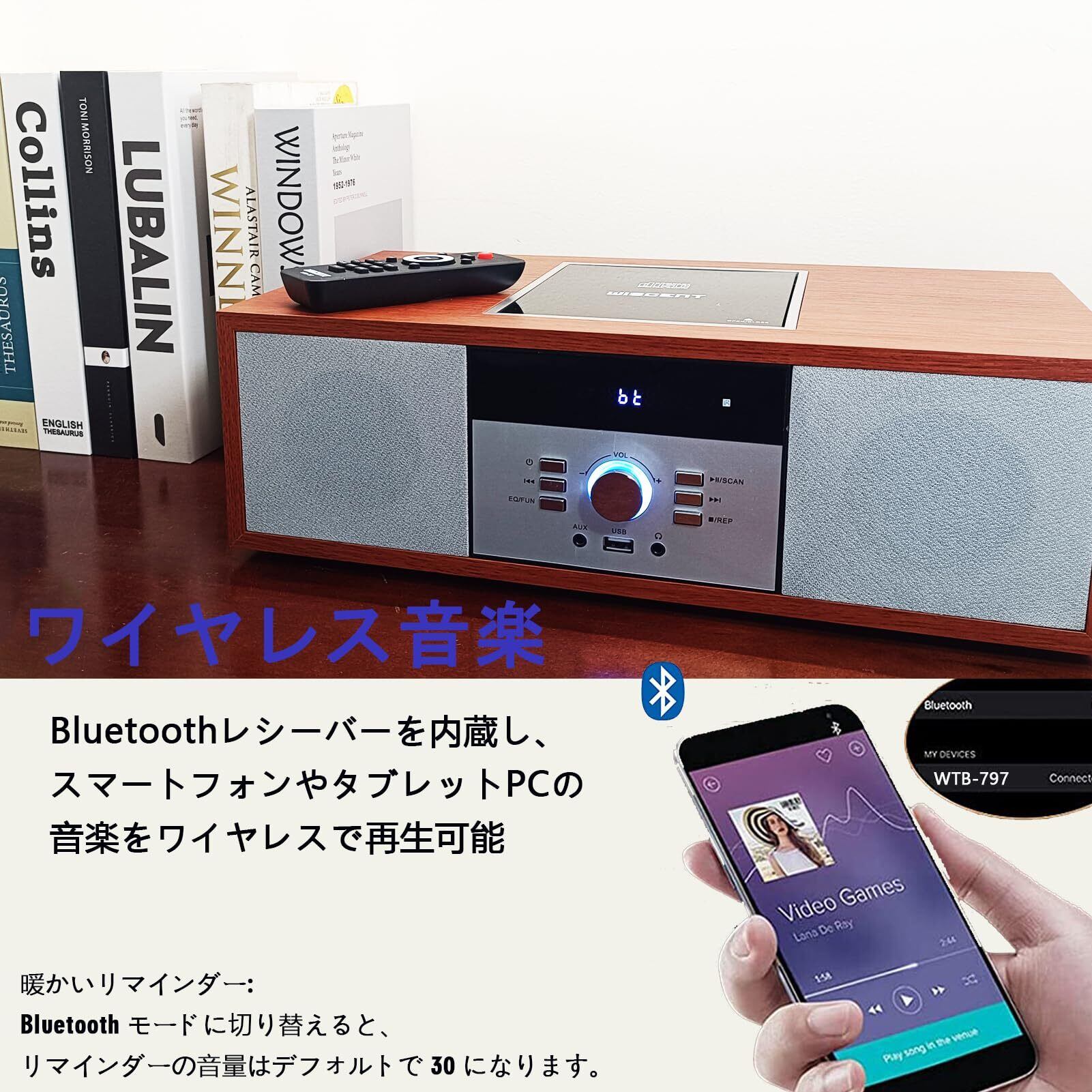 【在庫セール】ミニコンポ・セットコンポ CDプレーヤー レトロ/Bluetooth/FMステレオ/USB MP3再生/AUX入力、ヘッドフォンジャック、家庭用コンパクトONEBODYシステムを備えたビンテージスタイルのHiFiステレオシステム (WTB-797) | ニコニコSHOP