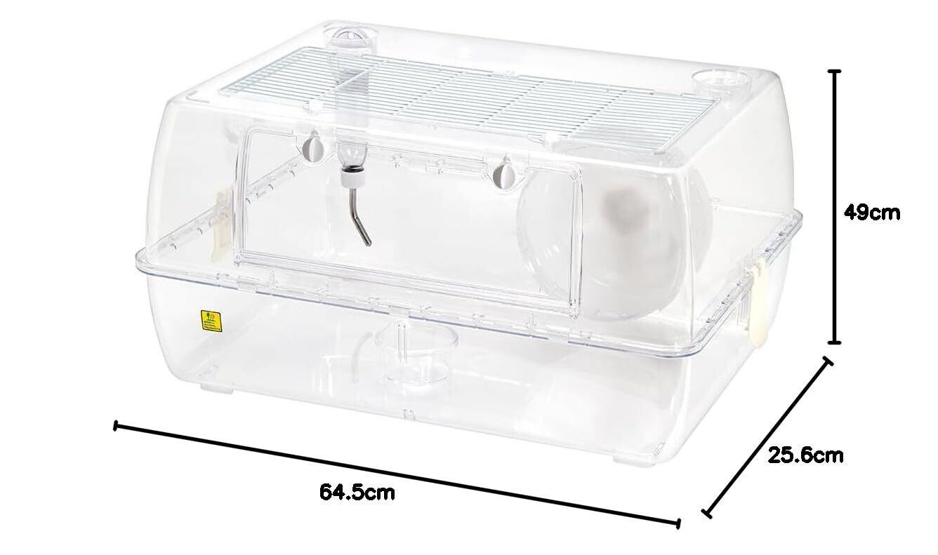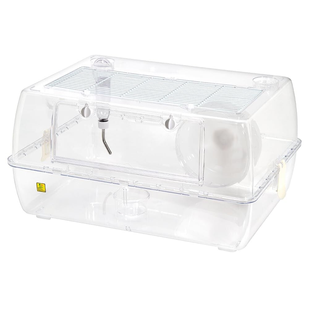 中が見やすい透明ボディと大きな扉で、生き物との距離がグッと近づく飼育ケースです。 組立てや分離も簡単にでき、隅々までスッキリとお掃除ができます! 横幅 約60cm 奥行きもタップリ、広々とした飼育空間です。 付属のホイール(サイレントホイールフラット)は、径21cmのゆったりサイズ。 奥行きが広く、ホイールの軸が表に出ないフラットな構造で快適に運動ができ、取り付け取り外しも簡単! 給水ボトルと食器も付いて、ハムスター等の小動物の飼育にピッタリです。