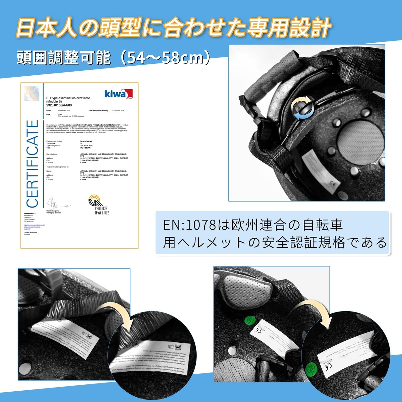 【CEセキュリティ認証】:当社のヘルメットはCE規格(EN 1078)を取得した認証製品で、自転車用 ヘルメット世界基準を満たす品質検査は、自転車ヘルメットの厳格な安全基準に合致している。ヘルメット 自転車用一体成形EPSは発泡し、衝突エネルギーを吸収し、衝撃傷害を減少し、走行をより安全にする。