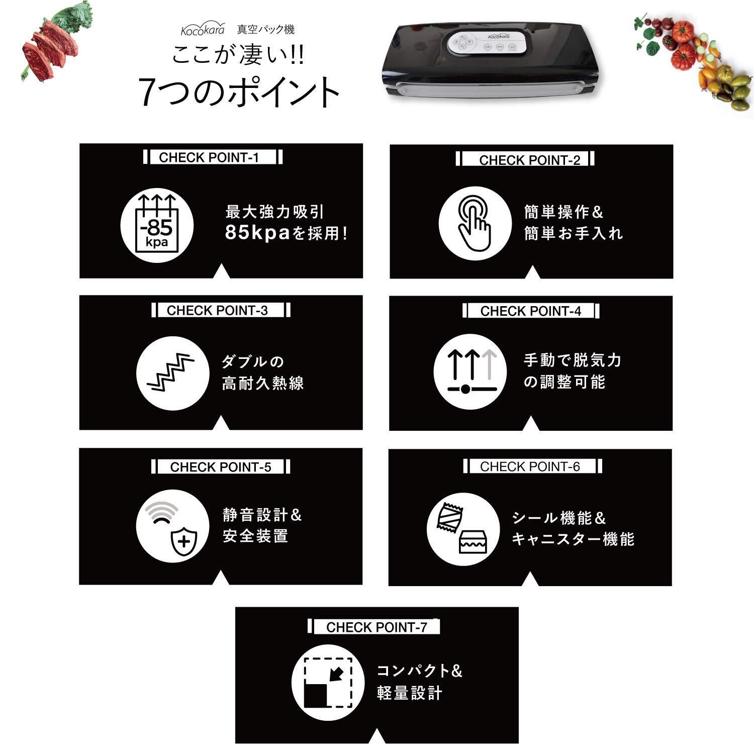 【強力吸引 -85Kpa採用 & ダブルの高耐久熱線採用 & 手動脱気】◉ Kocokara真空パック器では、強力吸引-85Kpaで約30秒で真空状態にします‼️◉真空パック機は脱気力が強いほど真空度が高まり、保存後の新鮮さが変わります‼️◉Kocokara真空パック機では2mm幅の高耐久熱線をダブルを採用し、真空後に剥がれるという難点をクリアしました‼️◉手動でお好みの真空具合に調節でき、パンやチーズなどの柔らかい食材などは、真空具合を確認しながら脱気する事が可能です‼️