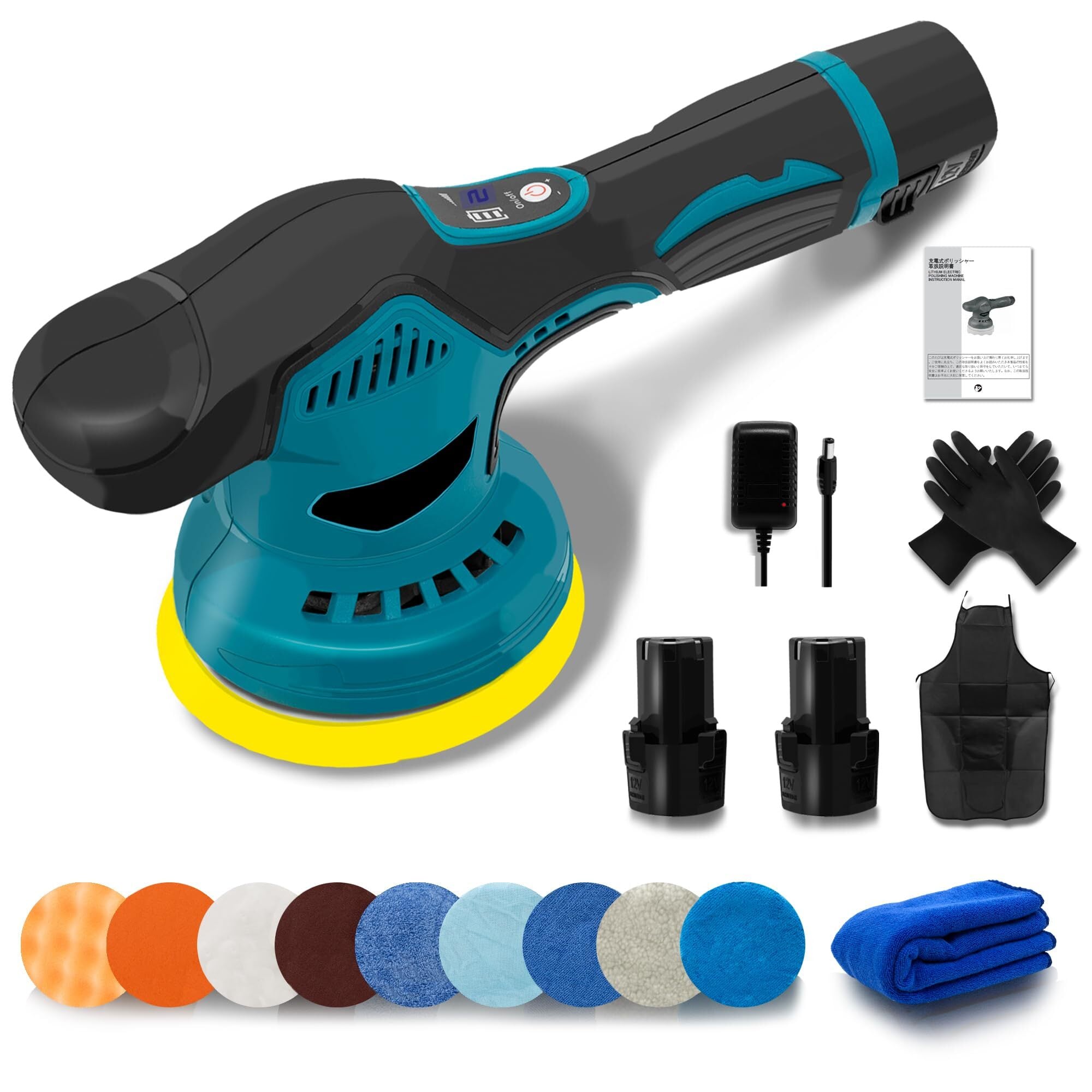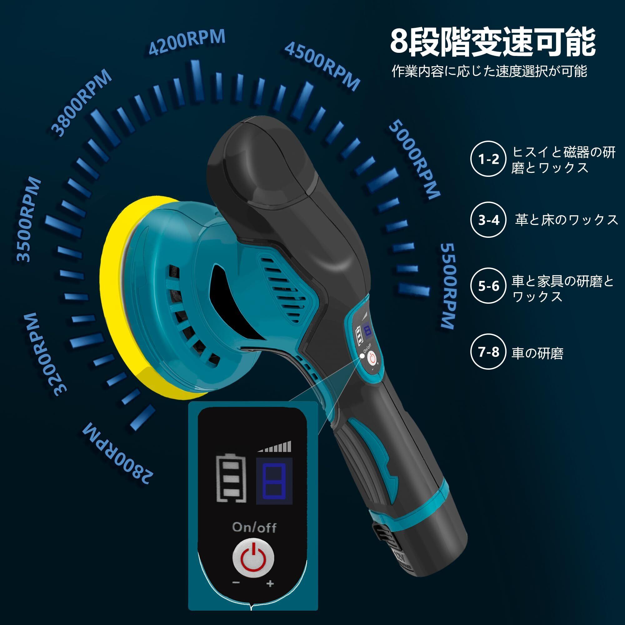 【2022最新】ポリッシャー 電動ポリッシャー ダブルアクションポリッシャー ディスク直径125mm 八段階変速 小型 コードレス ポリッシャー 11.1V 1500mAhバッテリー2個搭載 研磨 ポリッシャー 洗車 車磨き 鏡面磨き ワックス バフ 充電式ポリッシャー