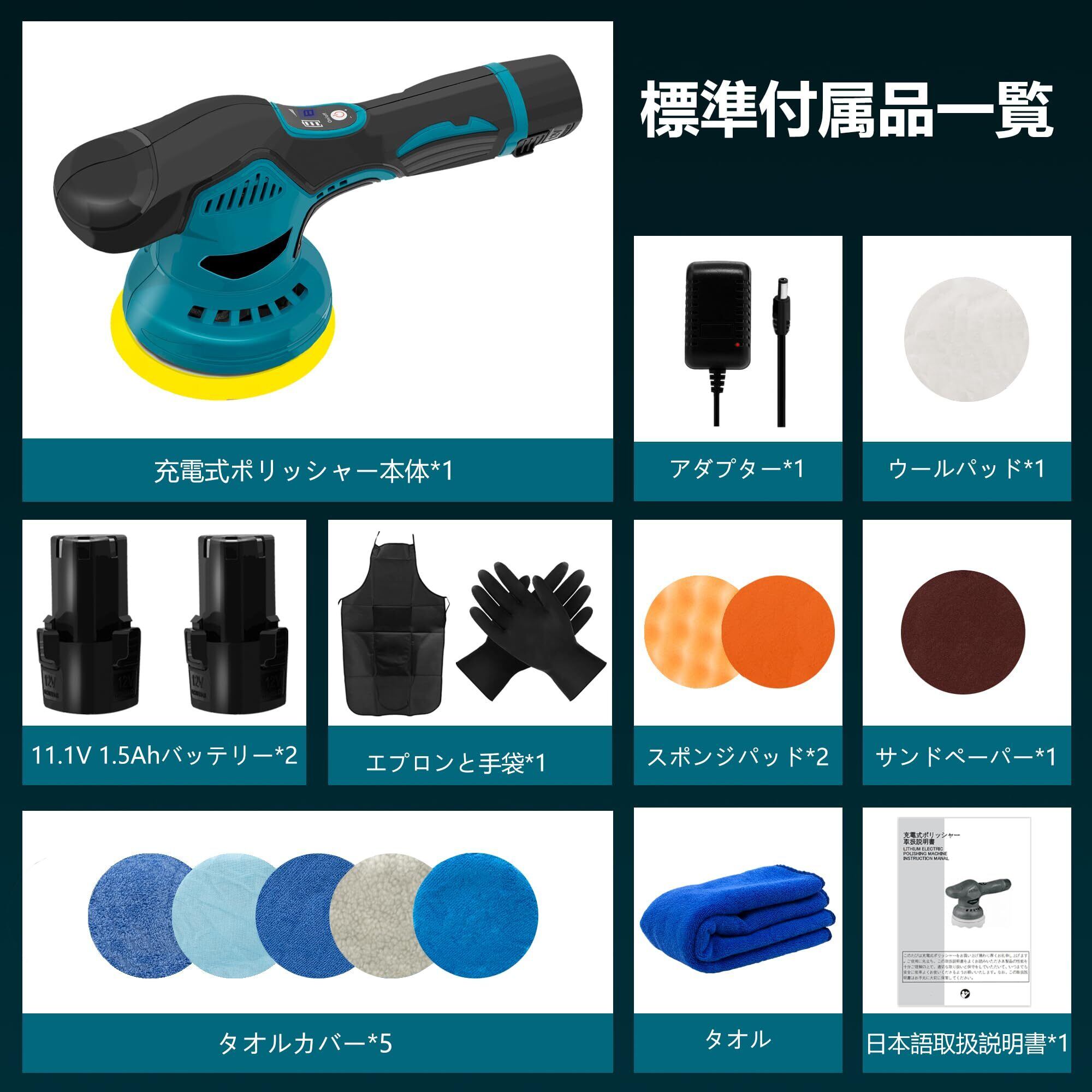 豊富な構成:充電式ポリッシャー本体1台、11.1V 1.5Ahリチウムイオン蓄電池2個、バッテリー充電用アダプター1 個、エプロン1枚、タオル1枚、手袋1組、波型スボンジパッド1枚、平型スポンジパッド1枚、サンドペーパー1枚、ウールパッド1個、タオルカバー5個、日本語取扱説明書1 冊。この充電式ポリッシャーは市販のΦ125 ~ Φ150 mmの研磨パッドを使用することができる。万が一納品された充電式ポリッシャーに欠陥があった場合は、無料で交換します。下記の手順でご連絡ください。【注文履歴>該当する注文を選択>注文内容を表示>商品をクリック>店舗名をクリック>質問する】