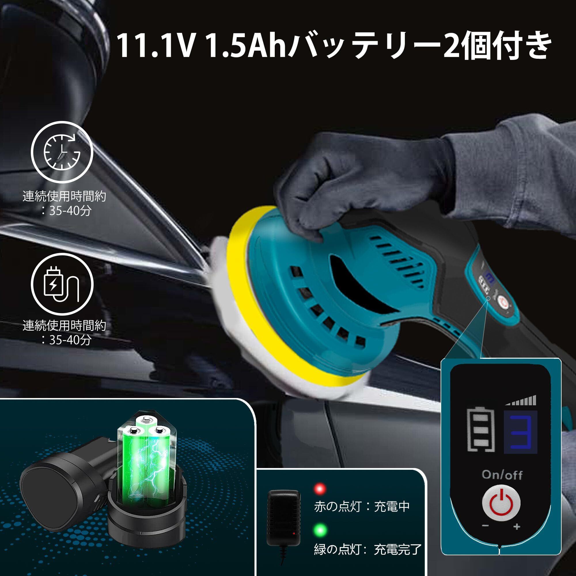 ポリッシャー 電動ポリッシャー ダブルアクションポリッシャー ディスク直径125mm 八段階変速 小型 コードレス ポリッシャー 11.1V 1500mAhバッテリー2個搭載 研磨 ポリッシャー 洗車 車磨き 鏡面磨き ワックス バフ 充電式ポリッシャー