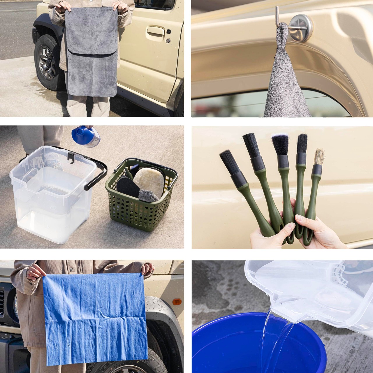 【洗車セット内容物一覧】マイクロファイバークロスだけでなく、吸水性に優れ傷もつきにくい大型のPVAスポンジクロス(人工セーム)もセットしています!昼間の洗車でもウォータースポットを残さずスピーディーに水滴を拭き上げることができます。 ①ステップバケツ×1 (透明バケツ+蓋) ②ストレージバスケット×1 ③タイヤ用柄付きスポンジ×1 ④マイクロファイバーブラシ×1 ⑤ディテイリングブラシ5本セット(ウルトラソフト×1 、ソ フト×1 、ミディア ム×2,ハード×1) ⑥スポンジ(ポリウ レタン製)×2 ⑦ウォッシンググ ローブ×2 ※人工羊毛製 ⑧拭き取り用PVAク ロス(ブルー大×1、グリーン大×1、ブ ルー小×1 ※使用前要水洗い ⑨拭き取りマイクロファイバークロス(大×3、 小×3) ※乾いた状態でボディ面に使用する際は、塗 装の状態により小さな傷をつける場合があり ますので十分ご注意ください。 ⑩エアコンルーバー 柄付きクロス×1、スペアクロス×2(柄付きクロスと合わせる とクロスは合計3)
