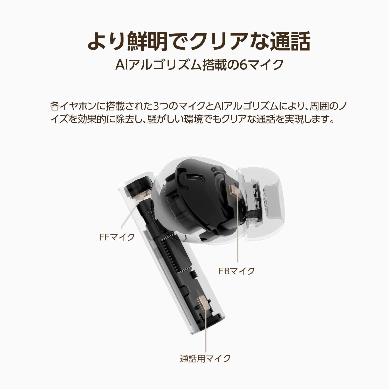 【AIアルゴリズムを搭載した6つ個のマイクで、より鮮明でクリアな通話】各イヤホンに搭載された3つのマイクとAIアルゴリズムにより、周囲のノイズを効果的に除去し、騒がしい環境でもクリアな通話を実現します。周囲のノイズをほとんどカットし、空気力学的構造で、風切り音を軽減します。