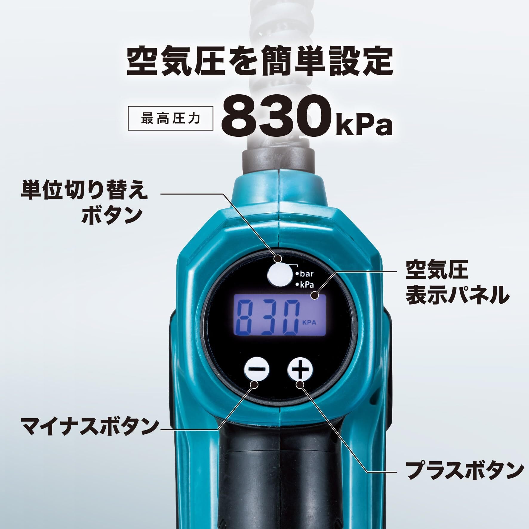 ・吐出量:10L/min(200kPa時) ・最高圧力:830kPa ・単位切替ボタン:空気圧の単位を切替可能。bar/kPaに対応 ・空気圧表示パネル:設定した空気圧で自動停止 ・マイナスボタン:空気圧設定値を減らす ・プラスボタン:空気圧の設定値を増やす ・温度保護機能付:使用中、本機やバッテリの温度が高温になると本機保護のためモータが自動停止します。 ・1充電あたりの作業量(目安):自転車タイヤ26インチ…約46回、ビーチボール(直径30cm)…約54回